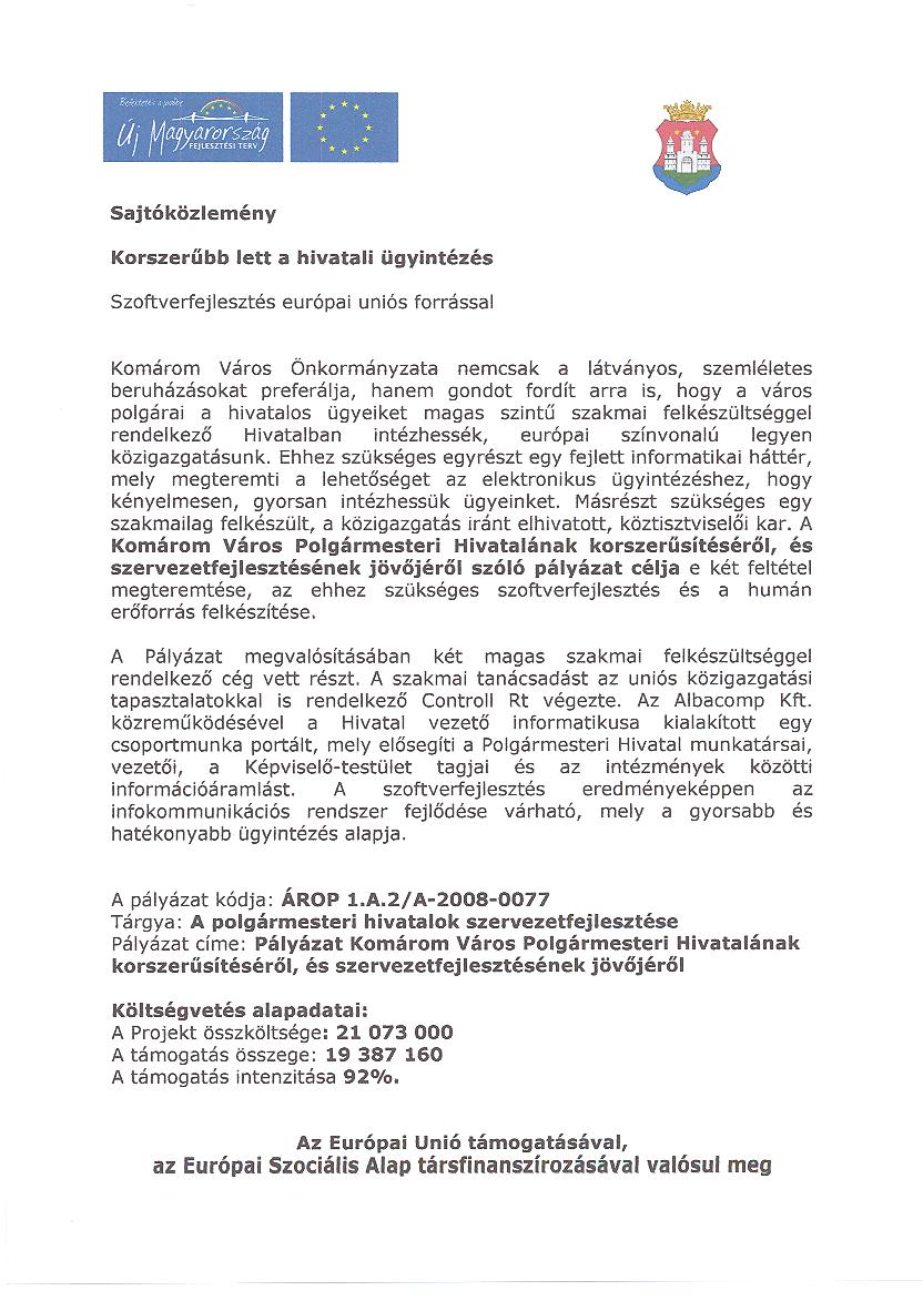 Pályázat Komárom Város Polgármesteri Hivatalának korszerűsítéséről és szervezetfejlesztésének jövőjéről