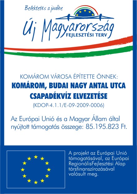 Megoldódhatnak a csapadékvíz által gyakorta okozott belvízi problémák a komáromi Budai Nagy Antal utcában, miután a város önkormányzata sikeresen pályázott, és mintegy 85 millió forint összegű európai uniós forrást nyert a "Komárom, Budai Nagy Antal utca csapadékvíz elvezetése" (KDOP-4.1.1/E-09-2009-0006) című pályázatával az Új Magyarország Fejlesztési Terv Közép-Dunántúli Operatív Programban. | Letöltés |