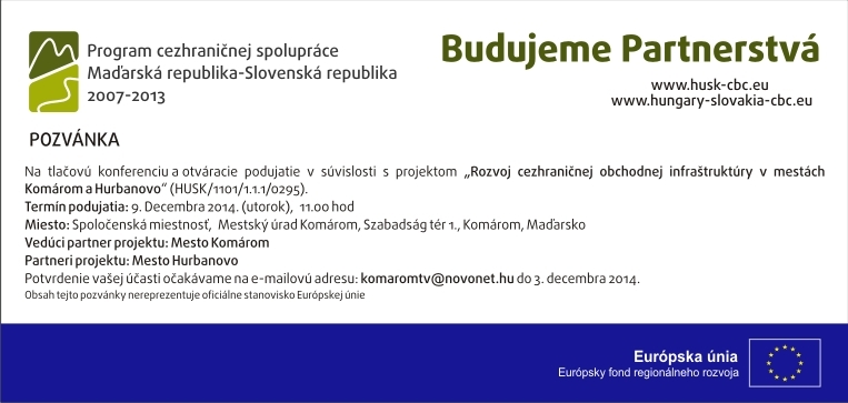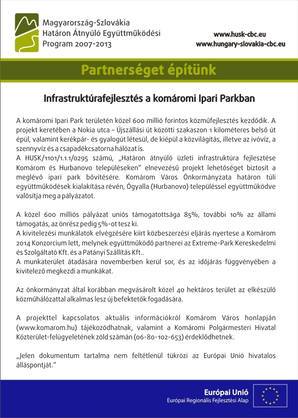 Téma: HUSK/1101/1.1.1/0295, "Határon átnyúló üzleti infrastruktúra fejlesztése Komárom és Hurbanovo településeken"