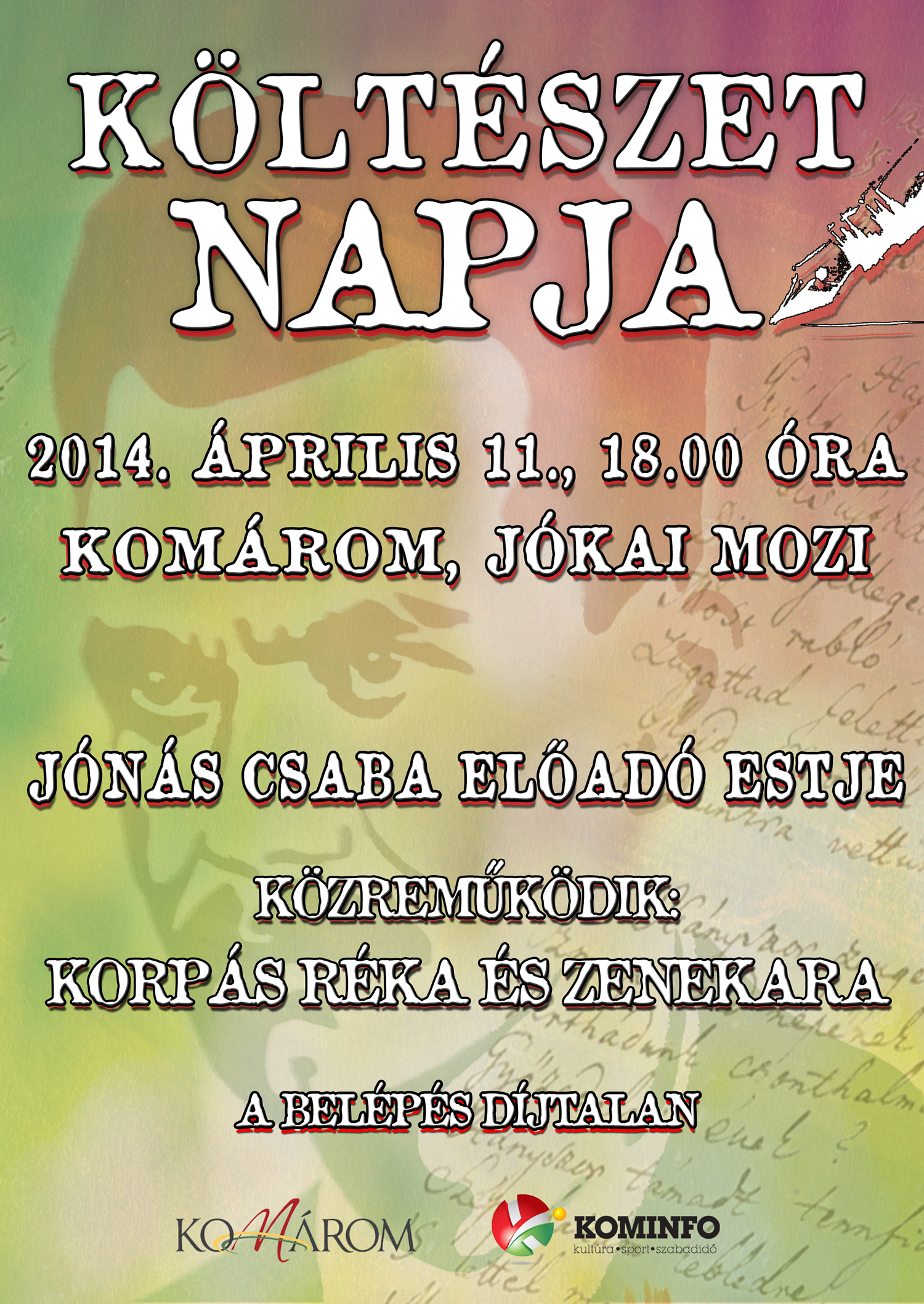 Az idei költészet napi rendezvényre április 11-én, pénteken, 18.00 órakor kerül sor a Jókai moziban. Az esten Jónás Csaba színművész ad műsort. Közreműködik Korpás Éva és zenekara.