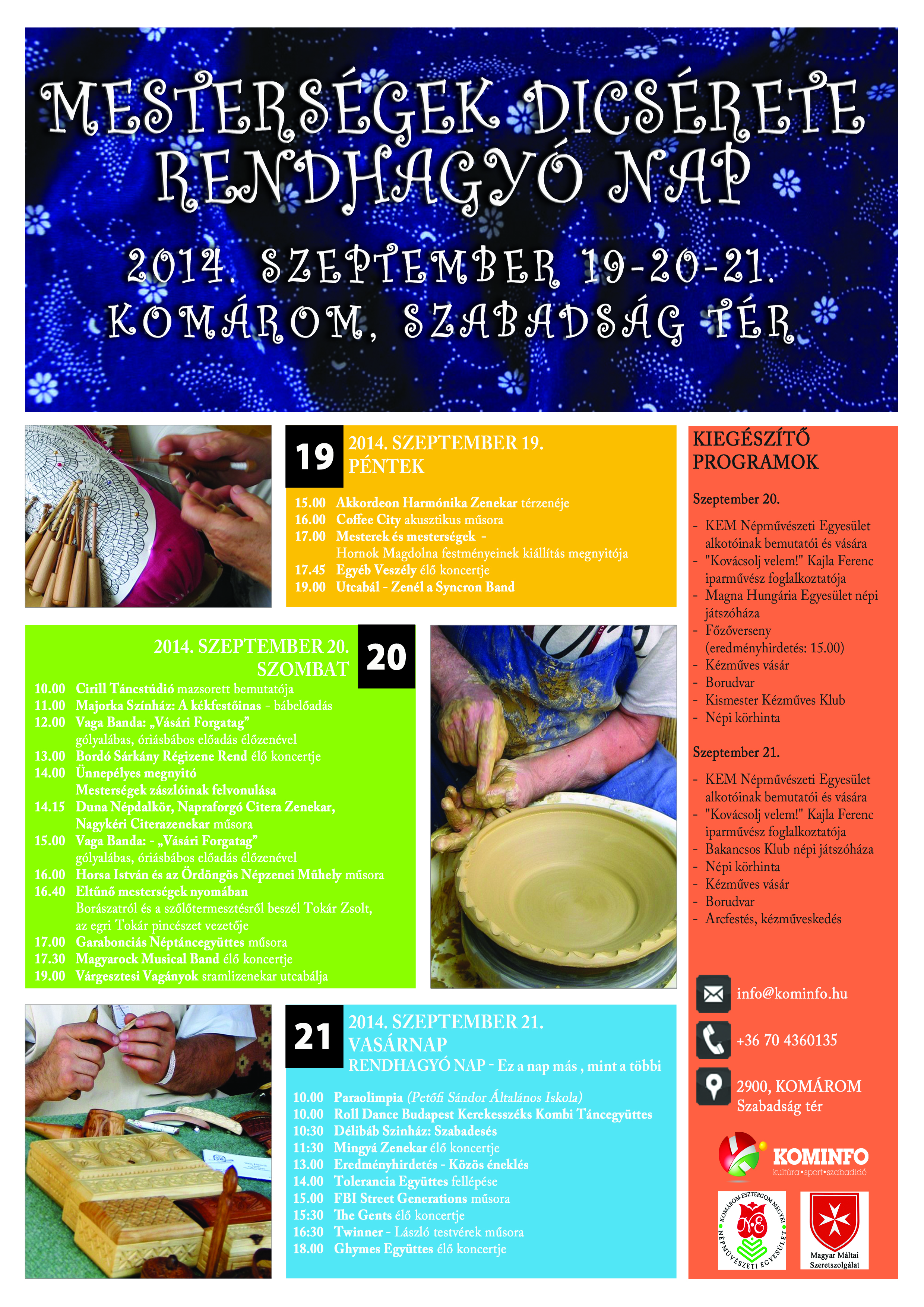 Ezúttal új helyszínre, a Szabadság térre költöznek be három napra a népművészet mesterei, hogy tudásukkal elbűvöljék a látogatókat. A szeptember 19-e és 21-e között zajló eseményt Nyikus Anna, a Szőnyi Kulturális Egyesület vezetője valamint a Komáromi Kulturális, Sport és Szabadidő Kft. közösen szervezi. A péntek egyfajta nulladik napja lesz a rendezvénynek, amikor is tizennégy harmonika szólal meg egyszerre városunk központjában, őket a Coffee City akusztikus műsora követi, Hornok Magdolna festményeiből pedig kiállítás nyílik Mesterek és mesterségek címmel az Arany 17. Rendezvényközpontban.