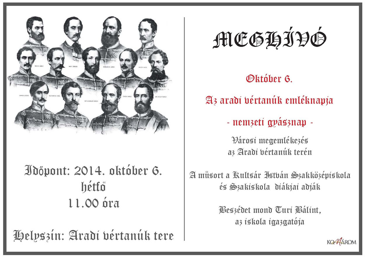 Időpont: 2014. október 6. hétfő, 11.00 óra, helyszín: az Aradi vértanúk tere.
