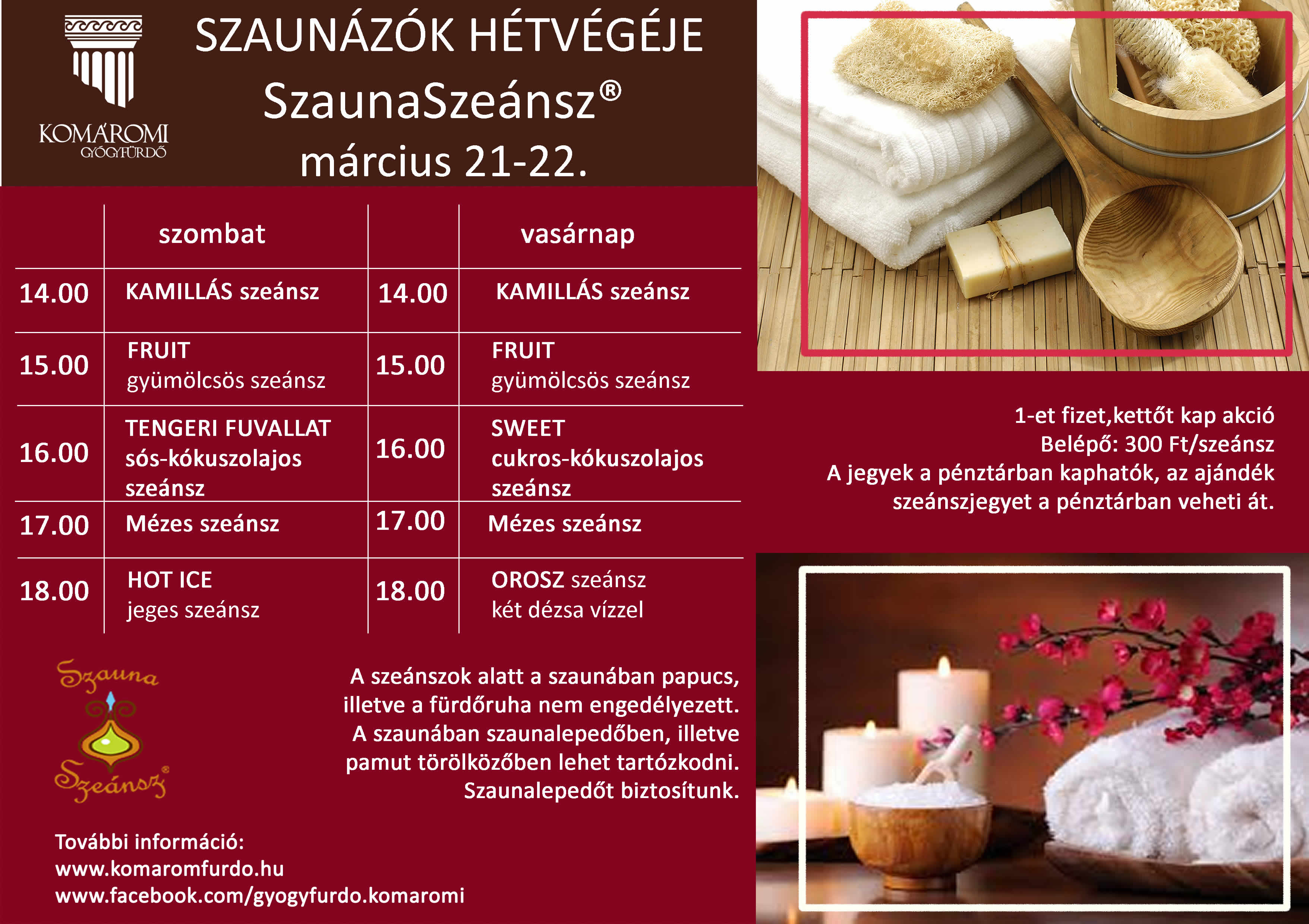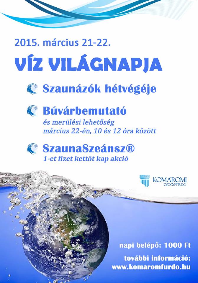 A március 21-22-i hétvégén kedvezményes fürdőbelépővel és különleges programokkal várja a látogatókat a Komáromi Gyógyfürdő. A víz világnapja alkalmából ezen a két napon 1700 Ft helyett 1000 Ft-os áron váltható a napi fürdőbelépő. Ekkor kerül sor a Szaunázók Hétvégéjére is, amire a szaunamesterek különleges szeánszokkal készülnek. A SzaunaSzeánsz®ok esetében is akciós lesz az ár: 1-et fizet kettőt kap akciót hirdet a fürdő.