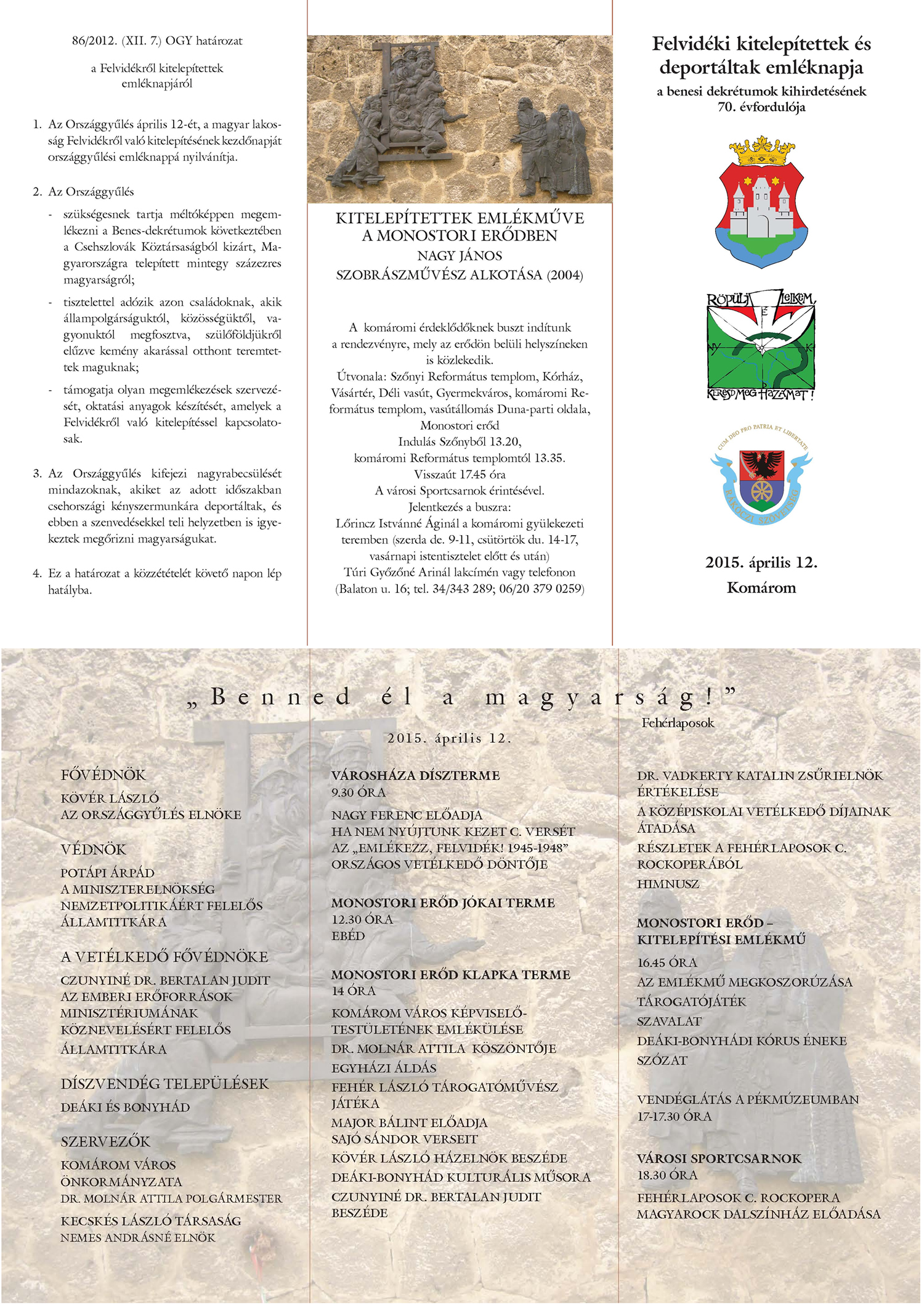 Április 12-e a Felvidékről kitelepítettek és deportáltak emléknapja. Városunkban egész napos eseménysorozattal emlékezünk meg történelmünk e sorstragédiákkal terhelt fejezetéről!