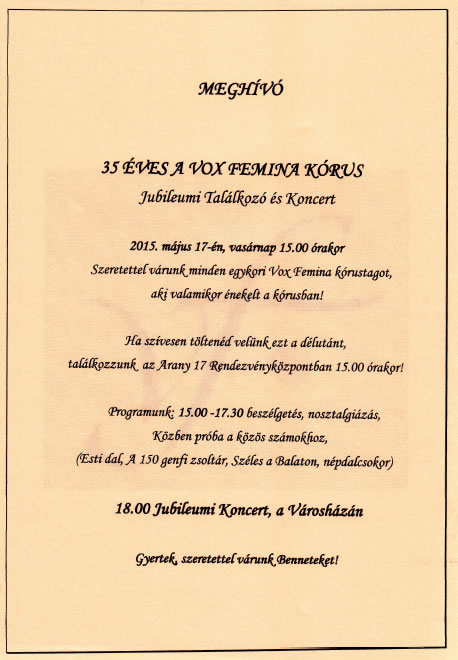 A 35 ÉVES A VOX FEMINA KÓRUS JUBILEUMI KONCERTJE2015. május 17 18:00, Városháza
