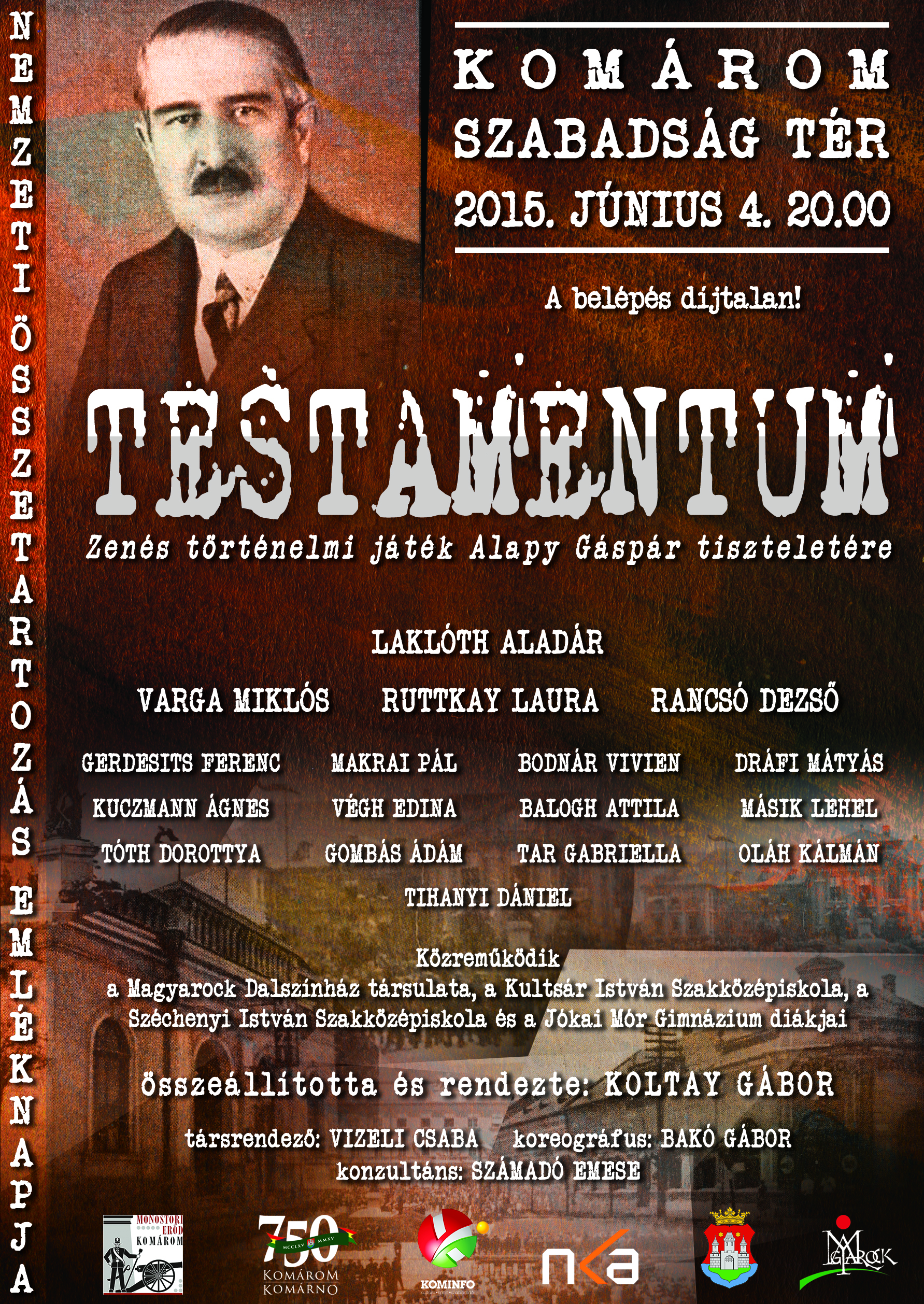 Az, amiről nem tudunk, kiesik a nemzettudatból, abból a következő generáció tagjai már nem tudnak erőt, hitet meríteni. Alapy Gáspárról, noha a 20. század egyik meghatározó alakja volt, viszonylag keveset tudunk. Hogy életútja, cselekedetei ne merüljenek a feledés homályába, Koltay Gábor rendező, városunk díszpolgára a nemzeti összetartozás napján, június 4-én, este 20.00 órától a Szabadság téren Testamentum címmel zenés pódiumjátékot visz színre egykori polgármesterünkről. Neki köszönhetjük, hogy a hét utcából álló településből a trianoni tragédiát követően virágzó kisváros lett Dél-Komárom. A bemutatóval kapcsolatban tartott közös sajtótájékoztatót Koltay Gábor rendező, dr. Molnár Attila Dél-, és Stubendek László Észak-Komárom polgármestere.