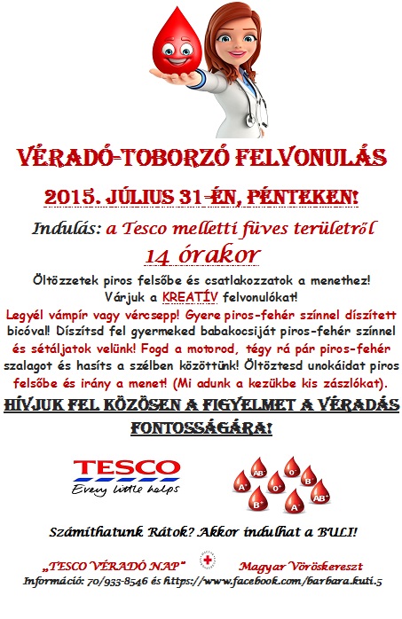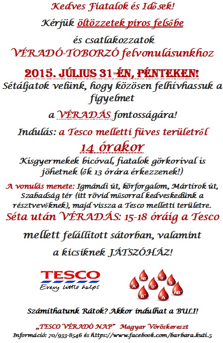 A Magyar Vöröskereszt Komárom-Esztergom Megyei Szervezete véradó-toborzó felvonulást szervez július 31-én, pénteken a Tesco parkolóban.