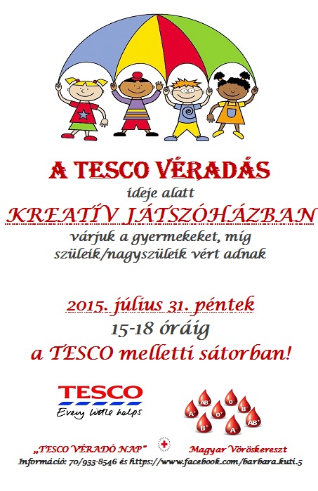 Ugyanezen a napon 15 órától 18 óráig VÉRADÁS lesz a Tesco melletti sátorban. Ez idő alatt kreatív játszóház várja a gyerekeket!