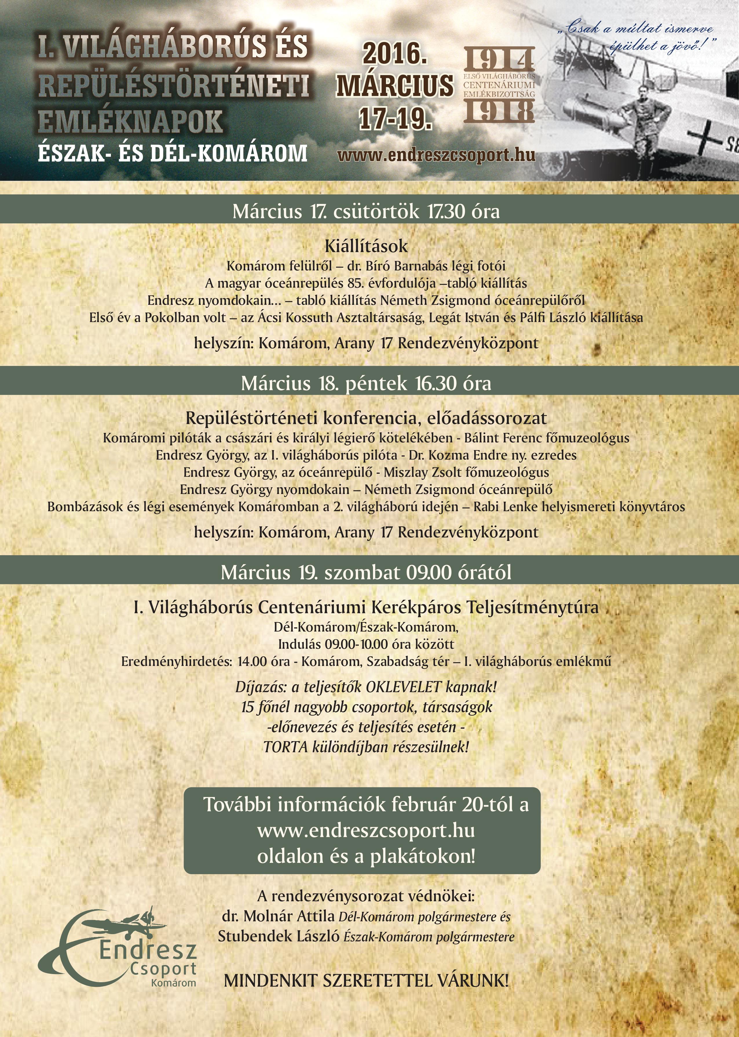 Repüléstörténeti napok: 2016. március 17-19. Kiálítások, konferenciák, előadások, túrák Észak- és Dél-Komáromban.