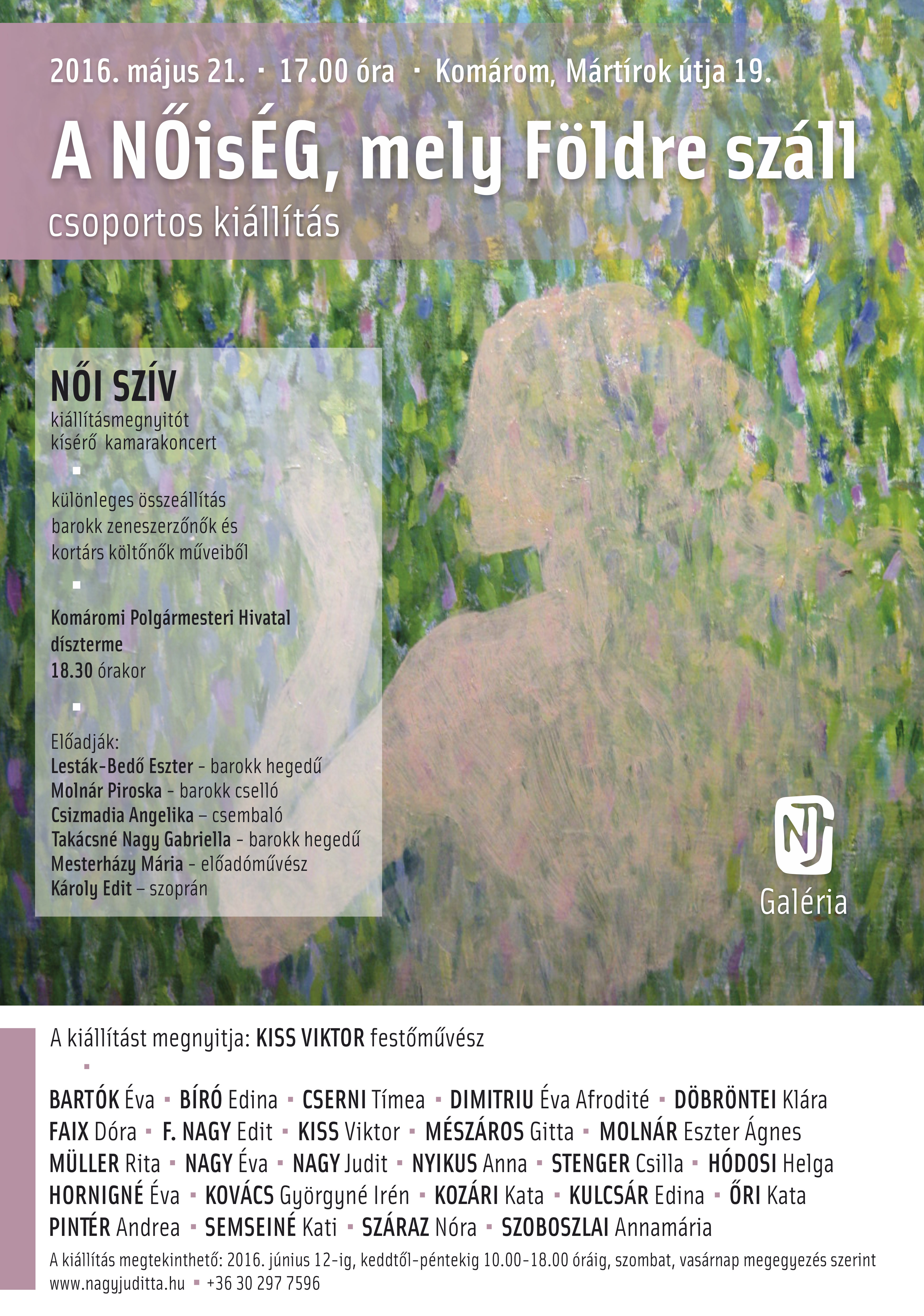 A NőisÉG, mely földre száll - csoportos képzőművészeti kiállítás és kamarakoncert - május 21. 17.00 óra NJ Galéria (Komárom, Mártírok útja 19.), illetve 18.30 óra Városháza, díszterem.