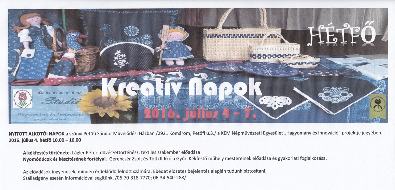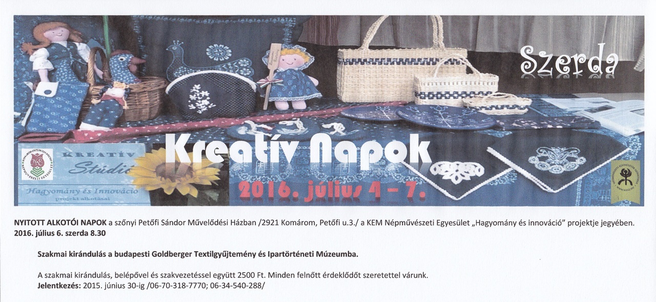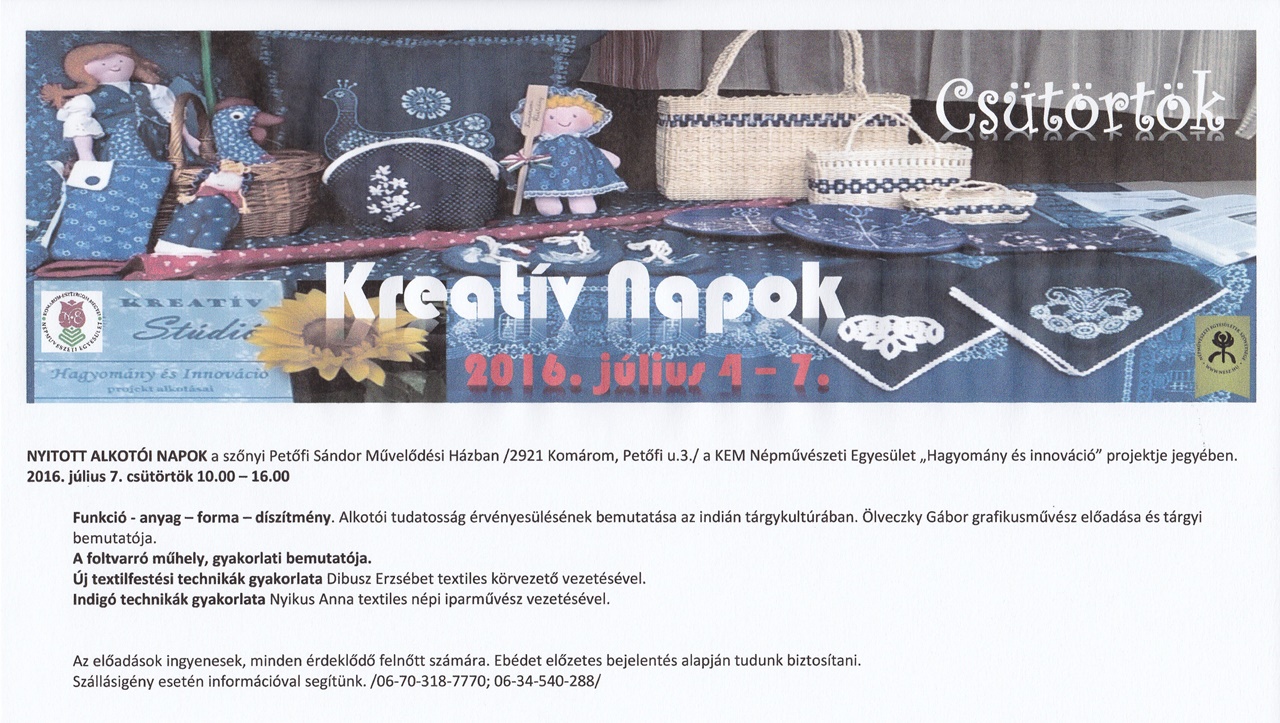 Nyitott alkotói napok a szőnyi Petőfi Sándor Művelődési Házban. 2016. július 4-7.