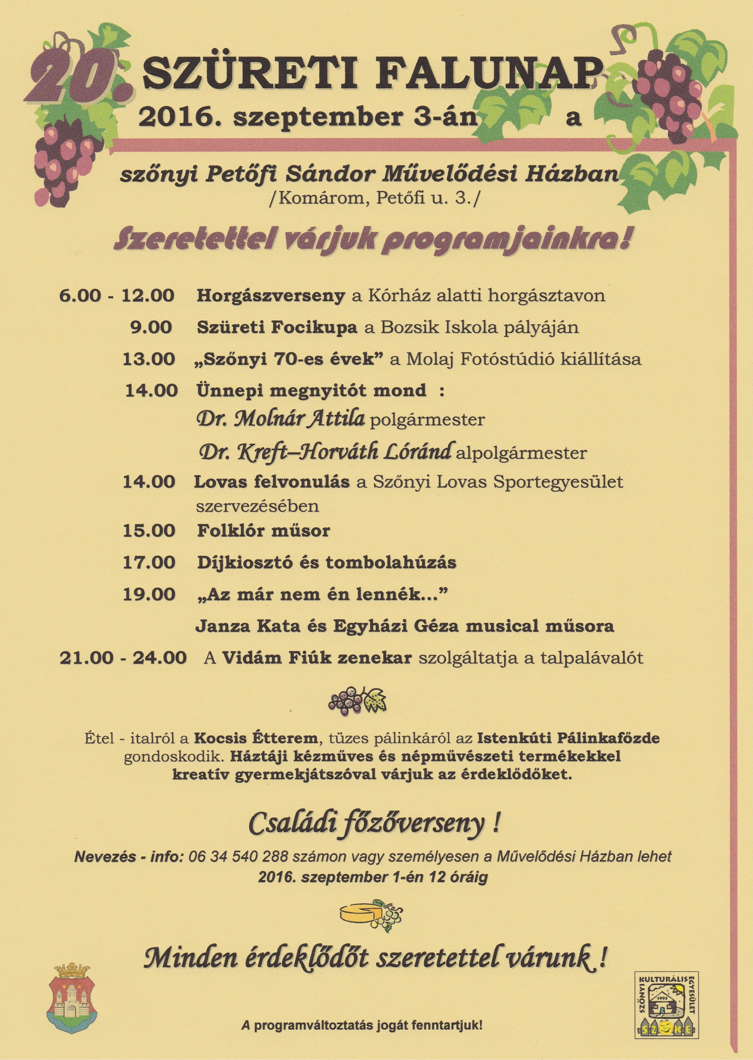 Ismét színes programokkal várja a komáromiakat a szüreti szőnyi falunap. 2016. szeptember 3. szombat, 13.00 óra, Petőfi Sándor Művelődési Ház.