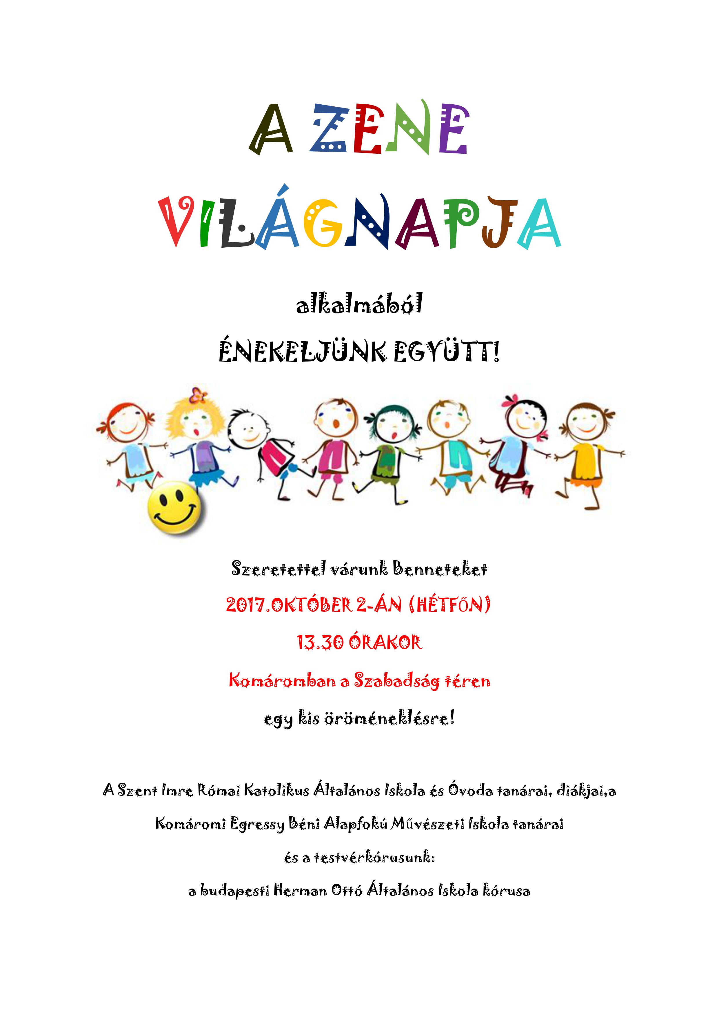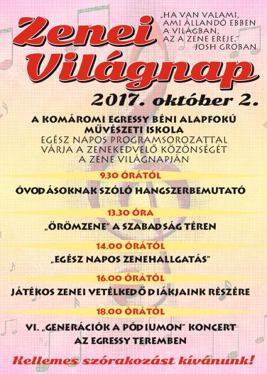 Október 1-jén a zene világnapja alkalmából színes, rendhagyó programokkal várja az érdeklődőket az Egressy Béni Zeneiskola, Alapfokú Művészetoktatási Intézmény, de lesz közös éneklés a Szabadság téren is.