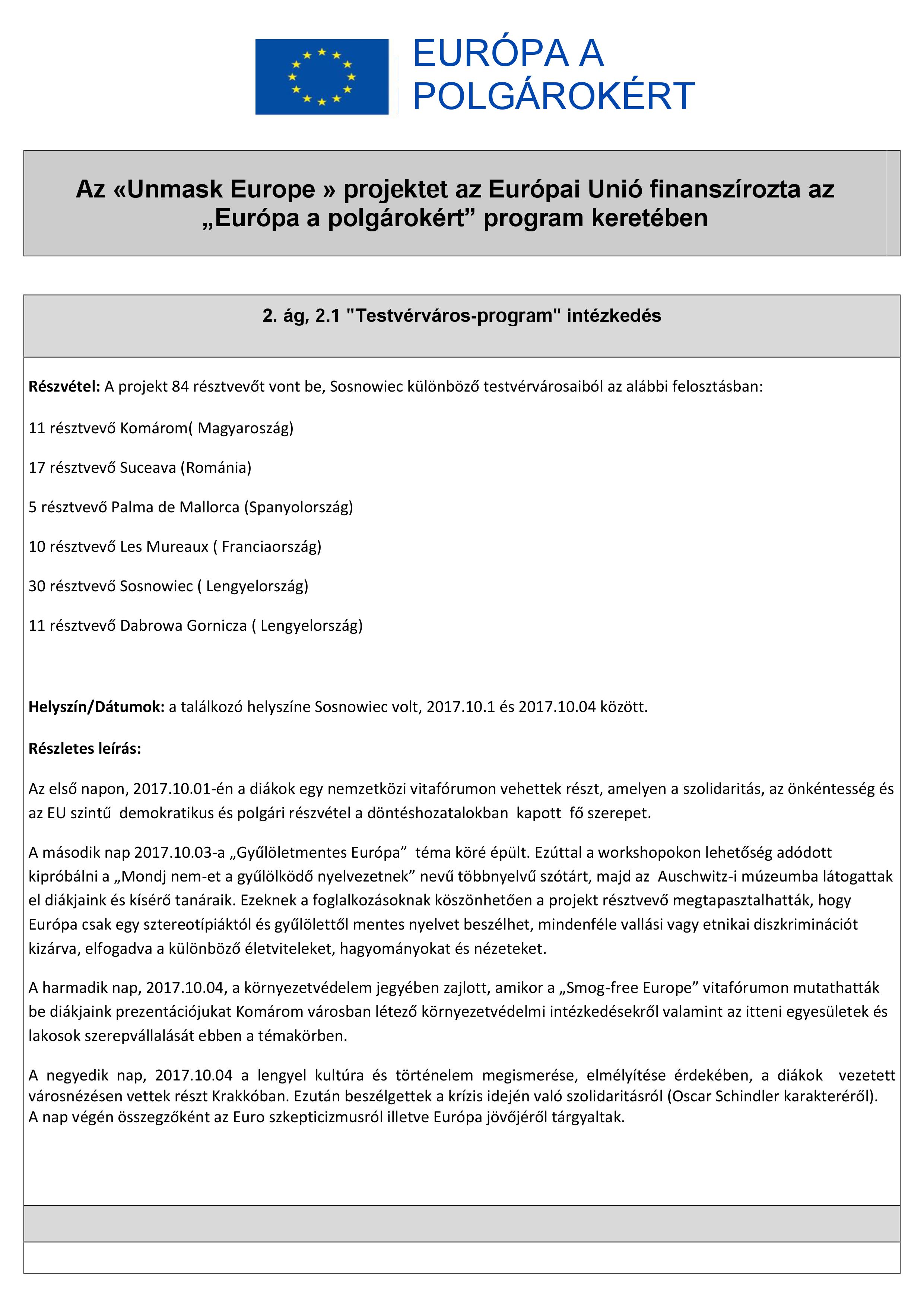 A tanulók több ország küldöttségeivel közösen főként környezetvédelmi kérdéseket tárgyaltak meg, de levetítettek egy városunkat bemutató prezentációt is. A diákok a három nap során látogatást tettek Krakkóba, Katowicébe, és felkeresték Auschwitzot is.
