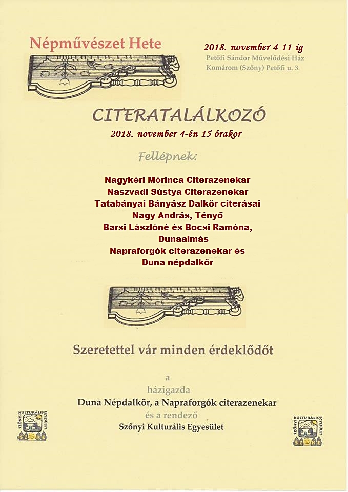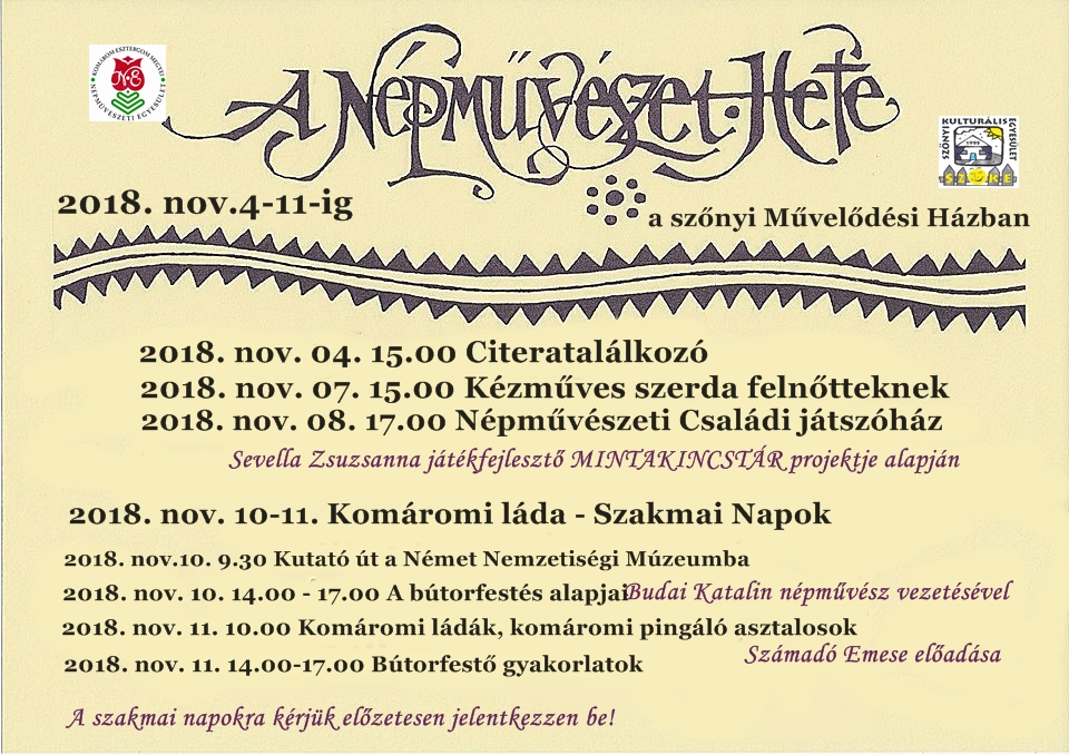 Az elmúlt évek hagyományához hűen idén is megrendezik a népművészet hetét, a szőnyi Petőfi Sándor Művelődési Házban, november 4-e és 11-e között.