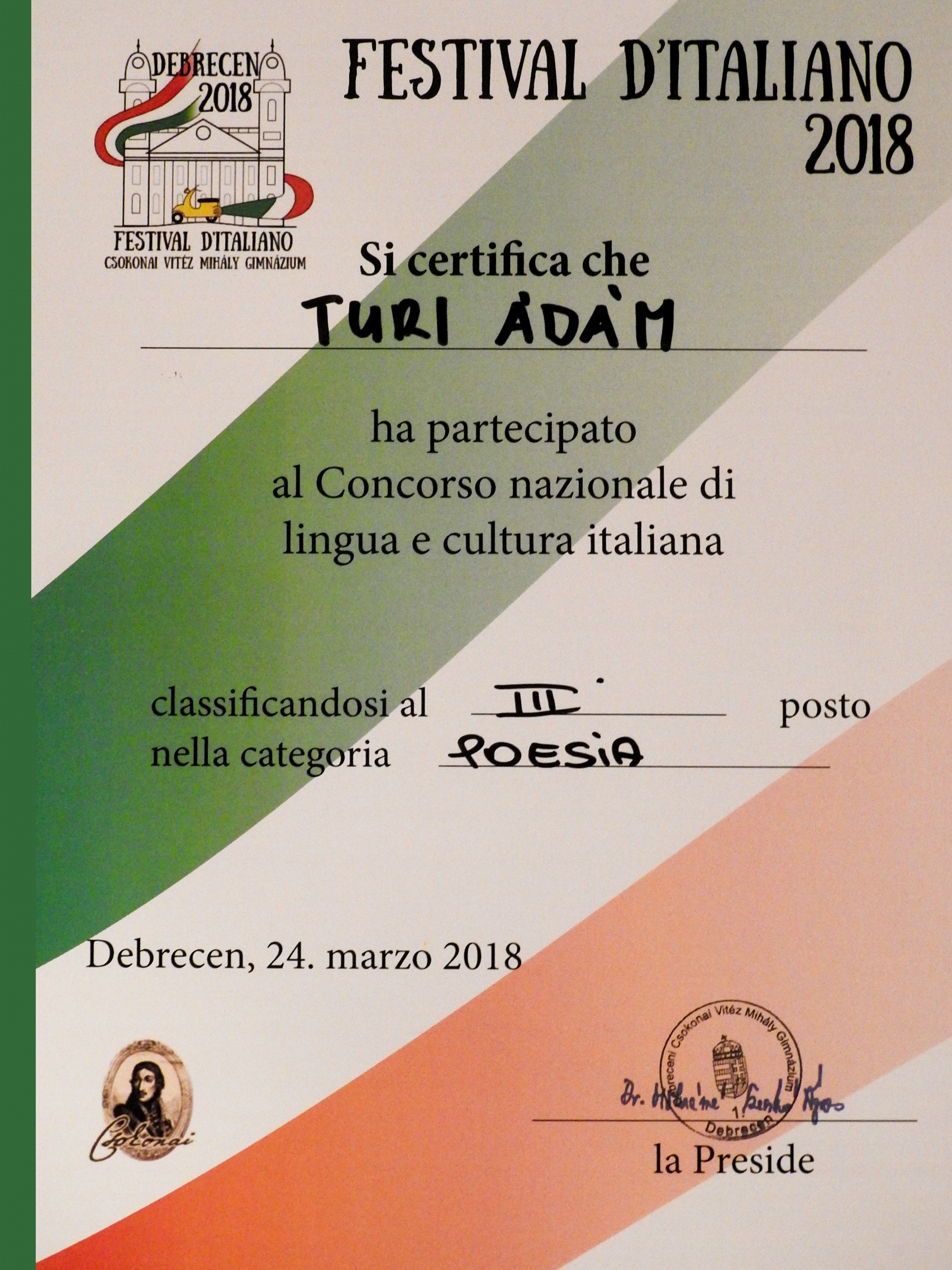Március 23-án és 24-én az ország 48 gimnáziumából 800 tanuló vett részt a 44. Festival d’ Italiano országos olasz nyelvi versenyen és találkozón. A rangos eseménynek idén a Debrecenben lévő Csokonai Vitéz Mihály Gimnázium adott otthont.