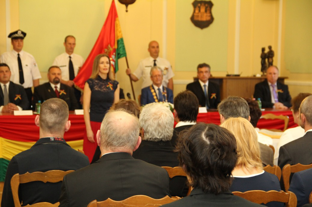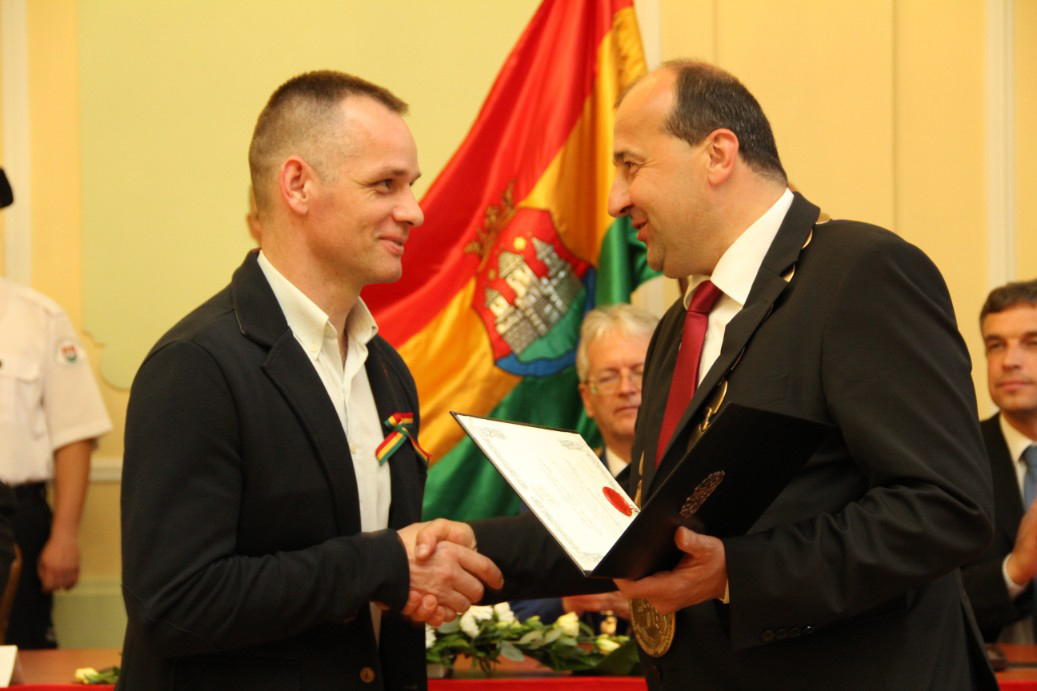 Észak- és Dél-Komárom képviselő testületei április 26-án, a komáromi csata emléknapján idén is megtartották együttes ünnepi testületi ülésüket, ezúttal a Duna déli partján, a Városháza dísztermében. A hivatalos ceremónián került sor a díszpolgári kitüntető cím, a Pro Urbe-, valamint a polgármesteri díjak átadására.