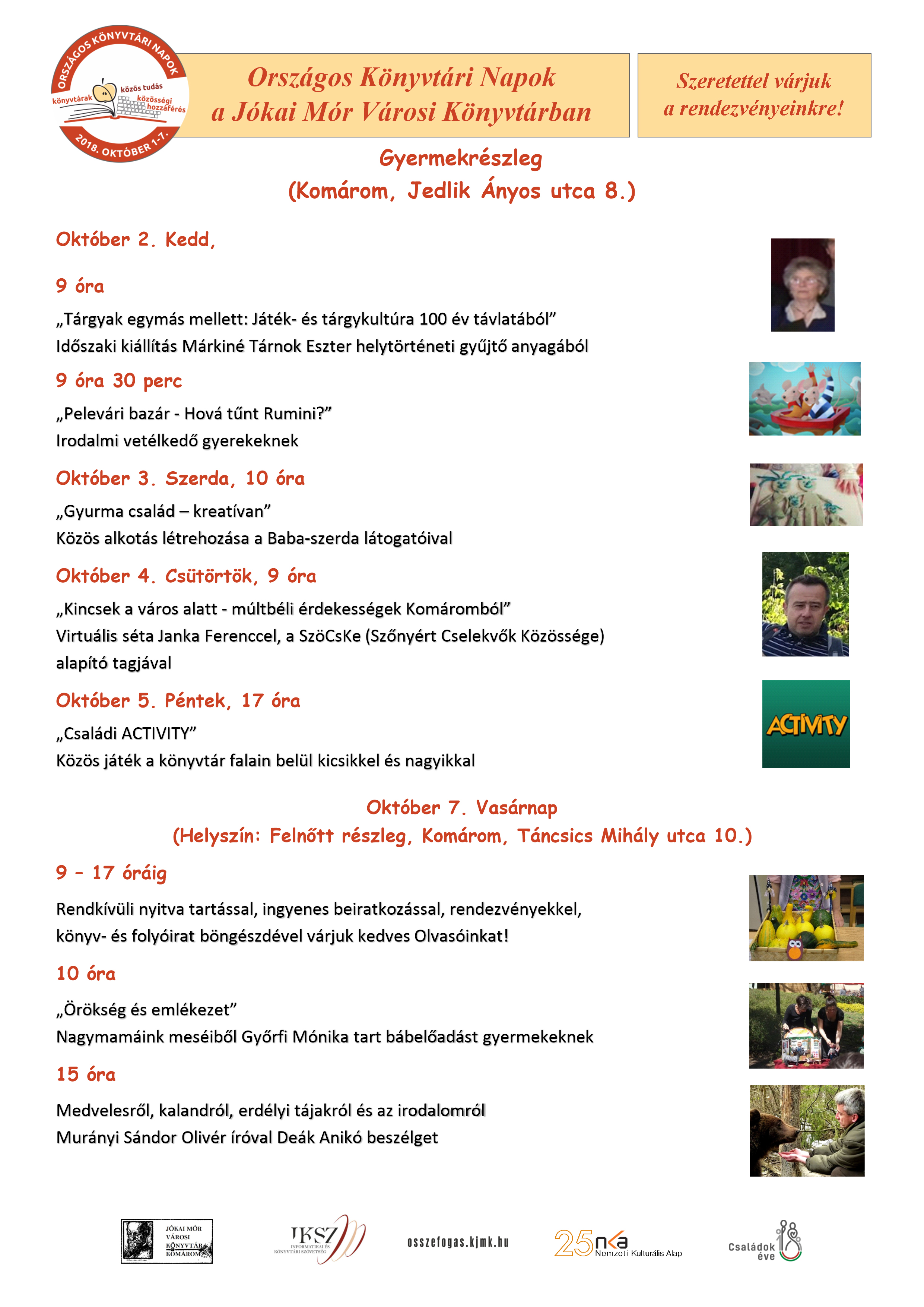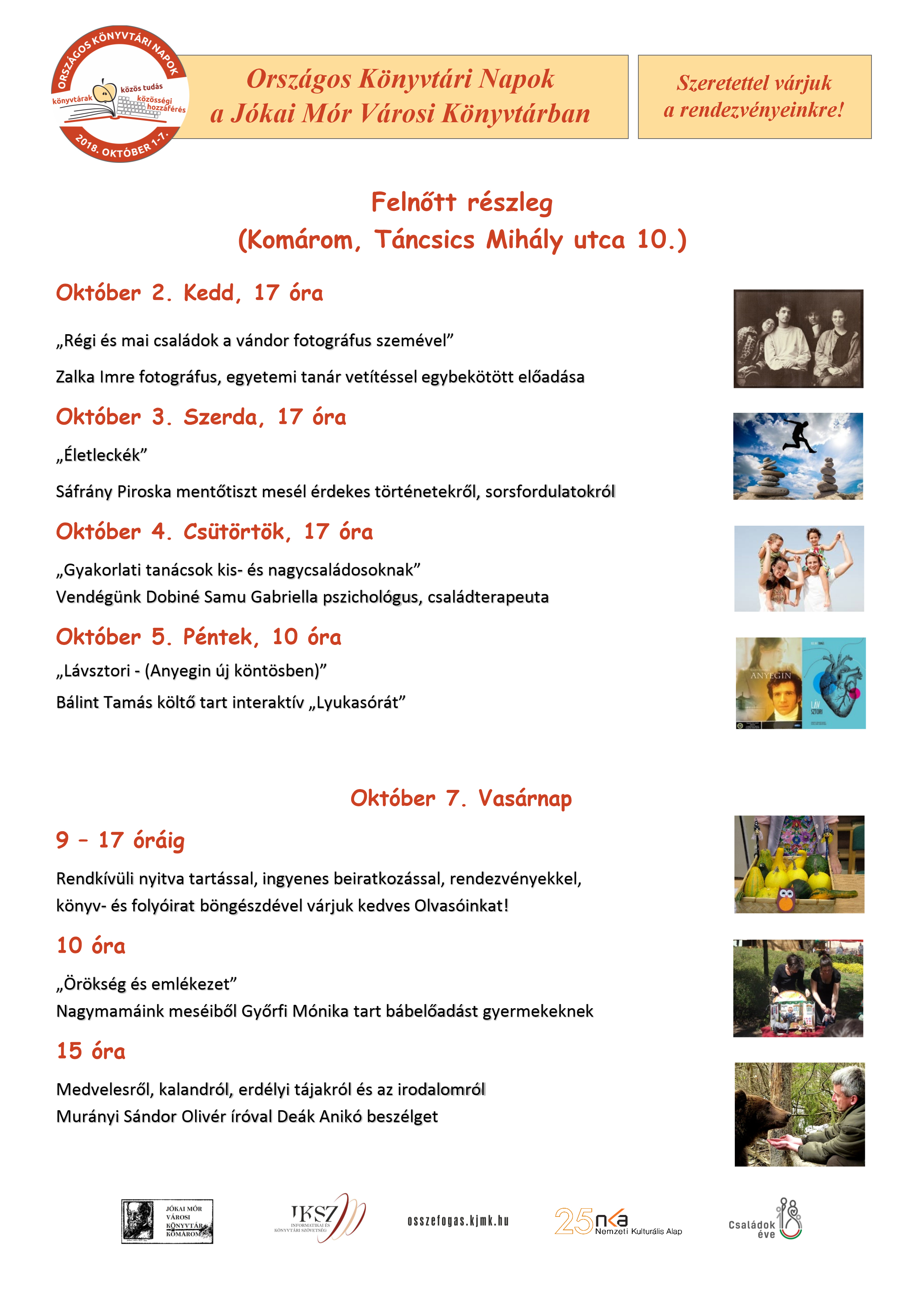 Az országos könyvtári napok alkalmából október 2-a és 7-e között külön rendezvénysorozattal készül a komáromi Jókai Mór Városi Könyvtár felnőtt - és gyermekkönyvtári részlege!