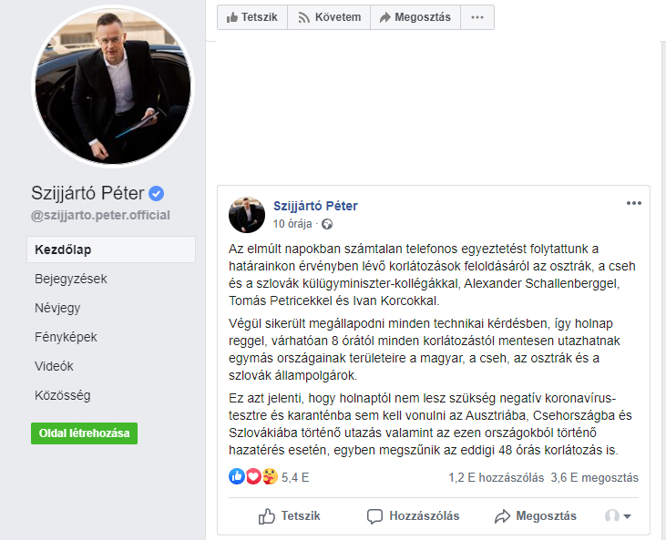 Ma reggel 8-tól 48 órás korlátozás nélkül utazhatunk Szlovákiába (valamint Csehországba és Ausztriába) - jelentette be tegnap este Szijjártó Péter külgazdasági és külügyminiszter a Facebookon.