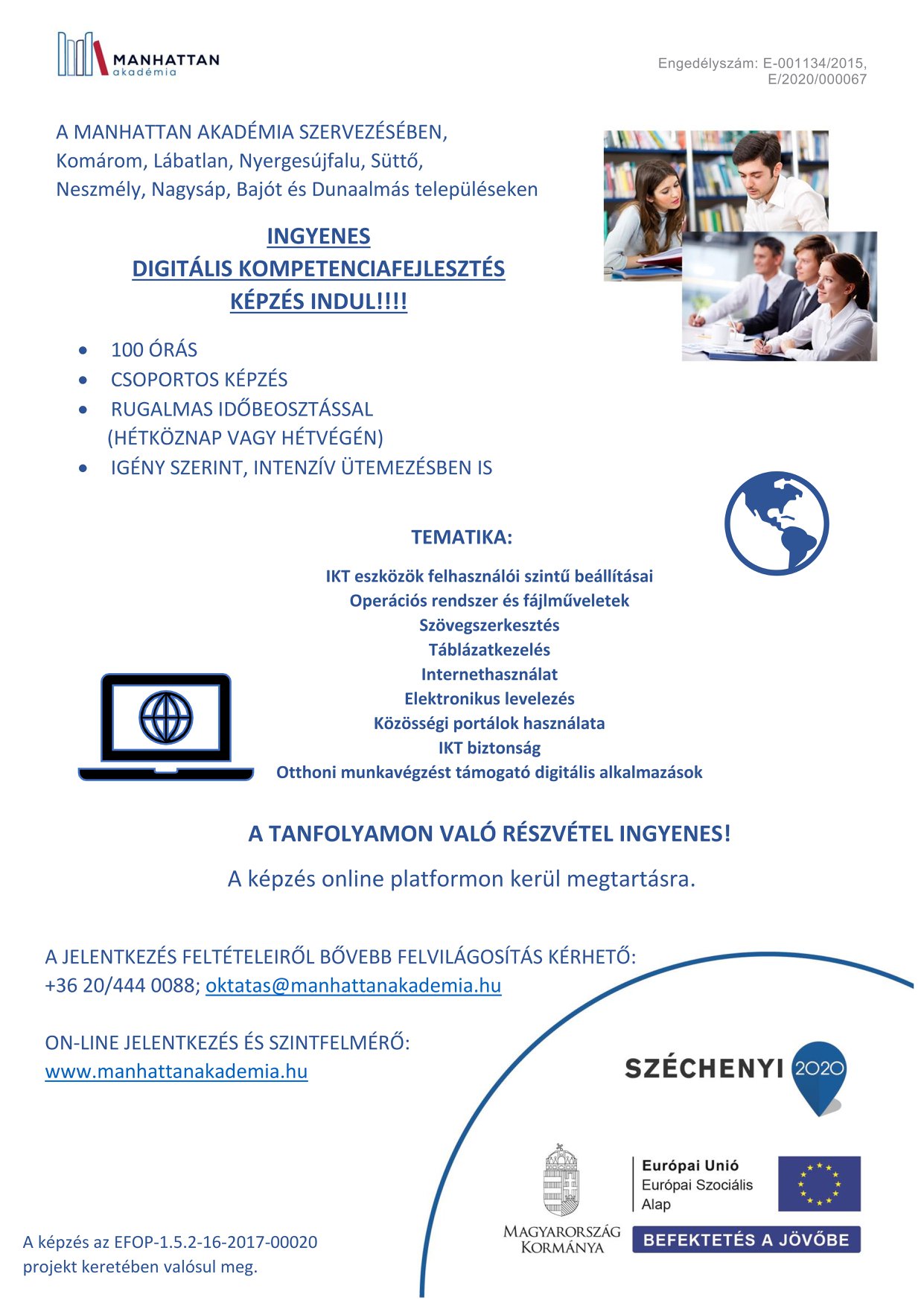 A képzés, az EFOP-1.5.2-16-2017-00020 projekt keretében valósul meg a budapesti Manhattan Akadémia szervezésében Lábatlanon, Nyergesújfalun, Süttőn, Neszmélyen, Nagysápon, Bajóton, Dunaalmáson és városunkban, Komáromban.