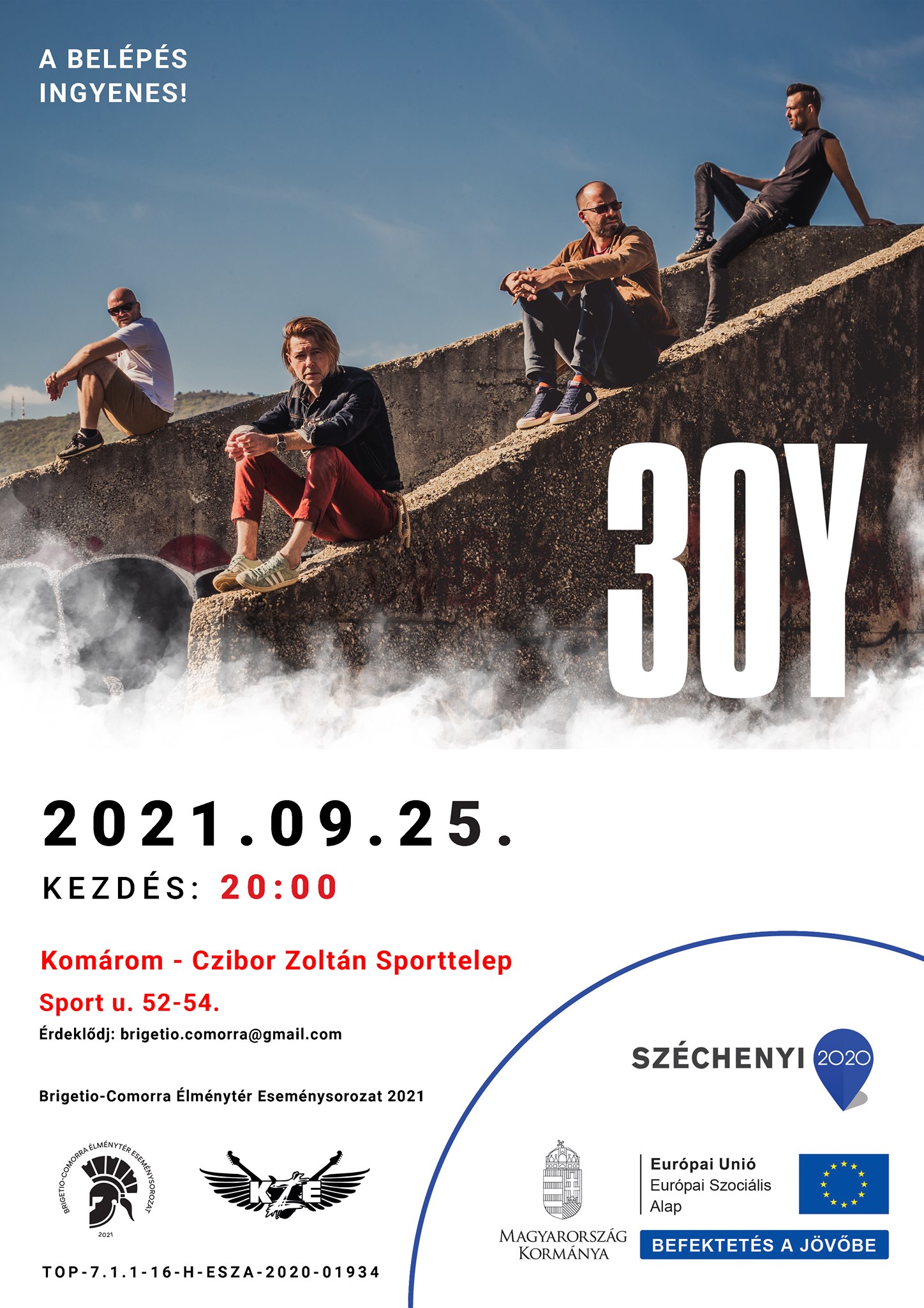 Ennek a programsorozatnak a zárásaként látogat Komáromba a 30y zenekar. A 2000-ben alakult pécsi kötődési alternatív rock együttes közel 10 éve meghatározó alakja a magyar könnyűzenének. Nevüket a 30Y szombathelyi buszjárattól kölcsönözték. Jelen vannak vidéki és budapesti klubokban a legnagyobb fesztiválokon. A húsz éves zenekarnak eddig tíz nagylemeze jelent meg, hangzásviláguk leginkább a kilencvenes évek ismert amerikai rockzenekaraihoz hasonlítható.
