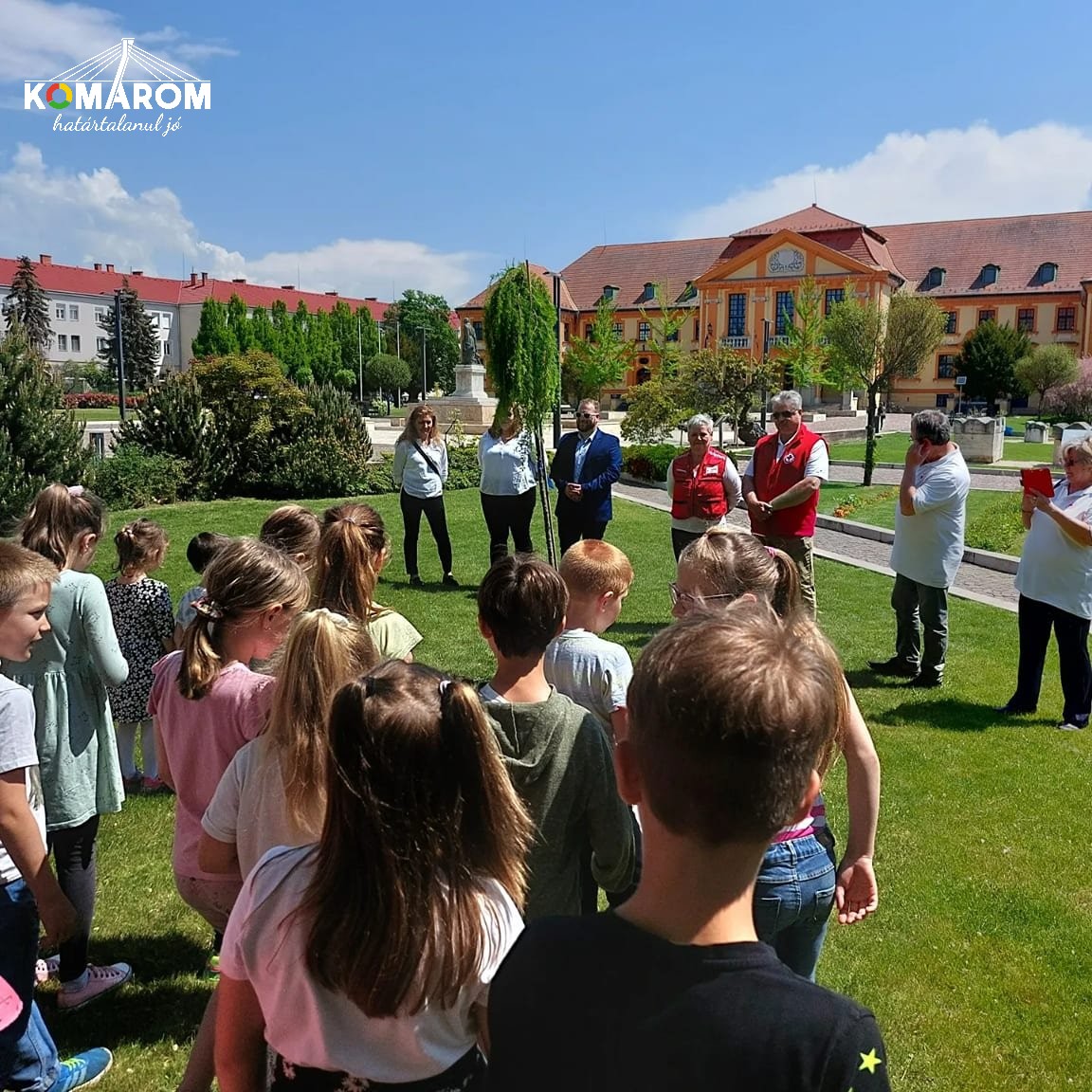 A táblák leleplezése után, az óvodások, iskolások, pedagógusok valamint a szervezet képviselői fát ültettek Henry Dunant születésének évfordulója alkalmából, a Petőfi Sándor Általános Iskola előtt.