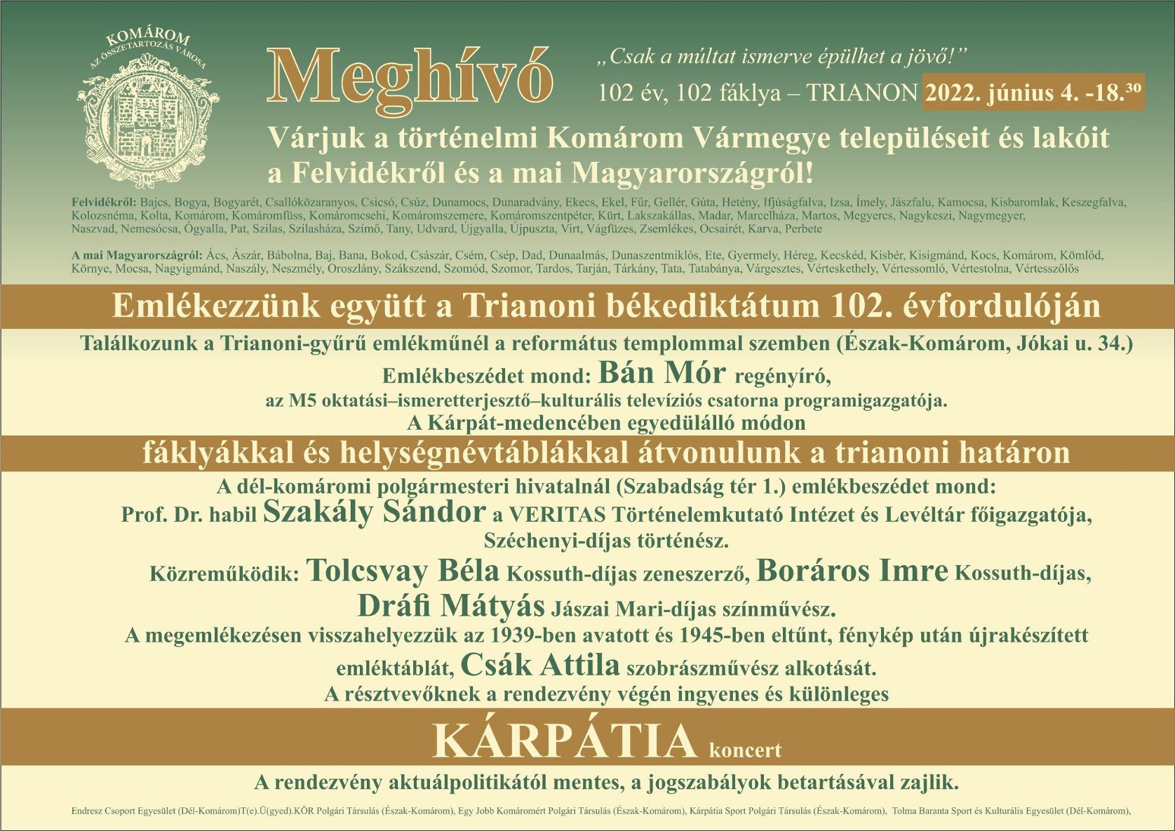 A nemzeti összetartozás napján június 4-én szombaton, a 102 év, 102 fáklya-Trianon megemlékezés Észak-és Dél-Komáromban vár mindenkit.