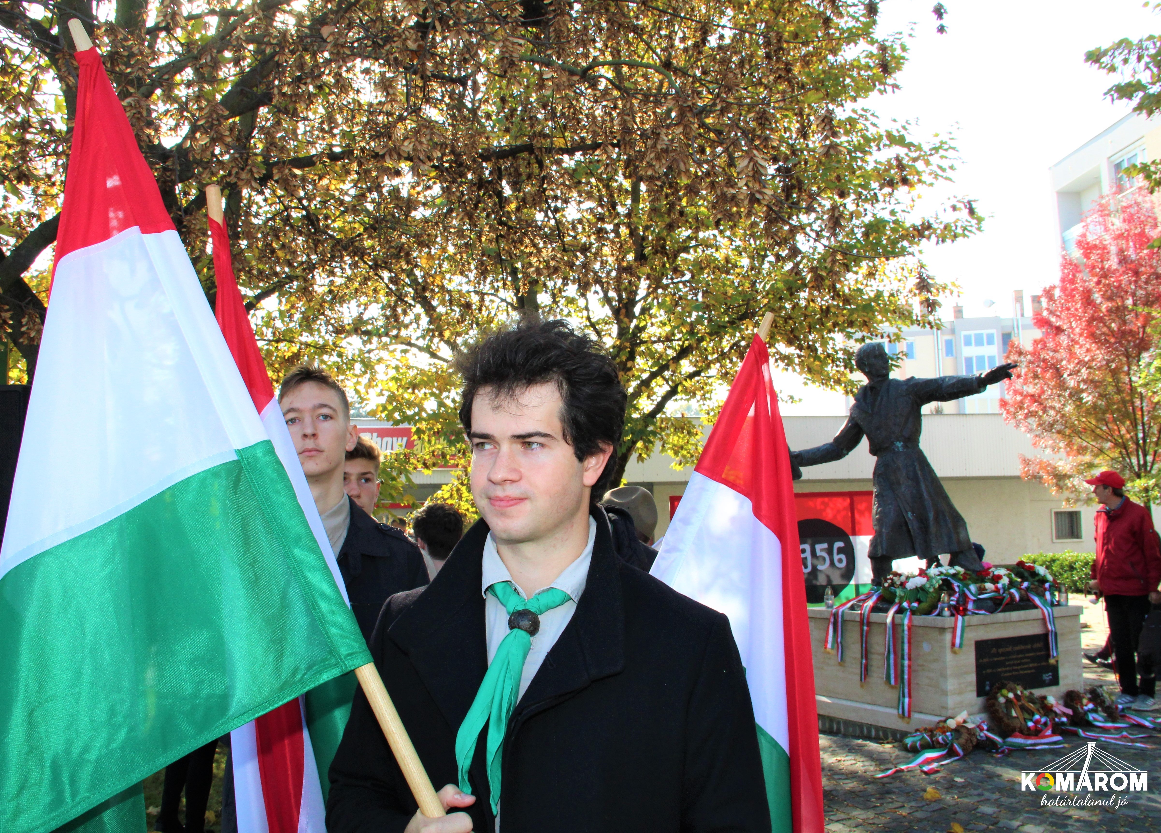 Az emléktábláknál Oláh Kálmán Pro Urbe-díjas tanár idézte meg az 56-os komáromi hősöket, közreműködött Janovszki Csenge népdalénekes.
