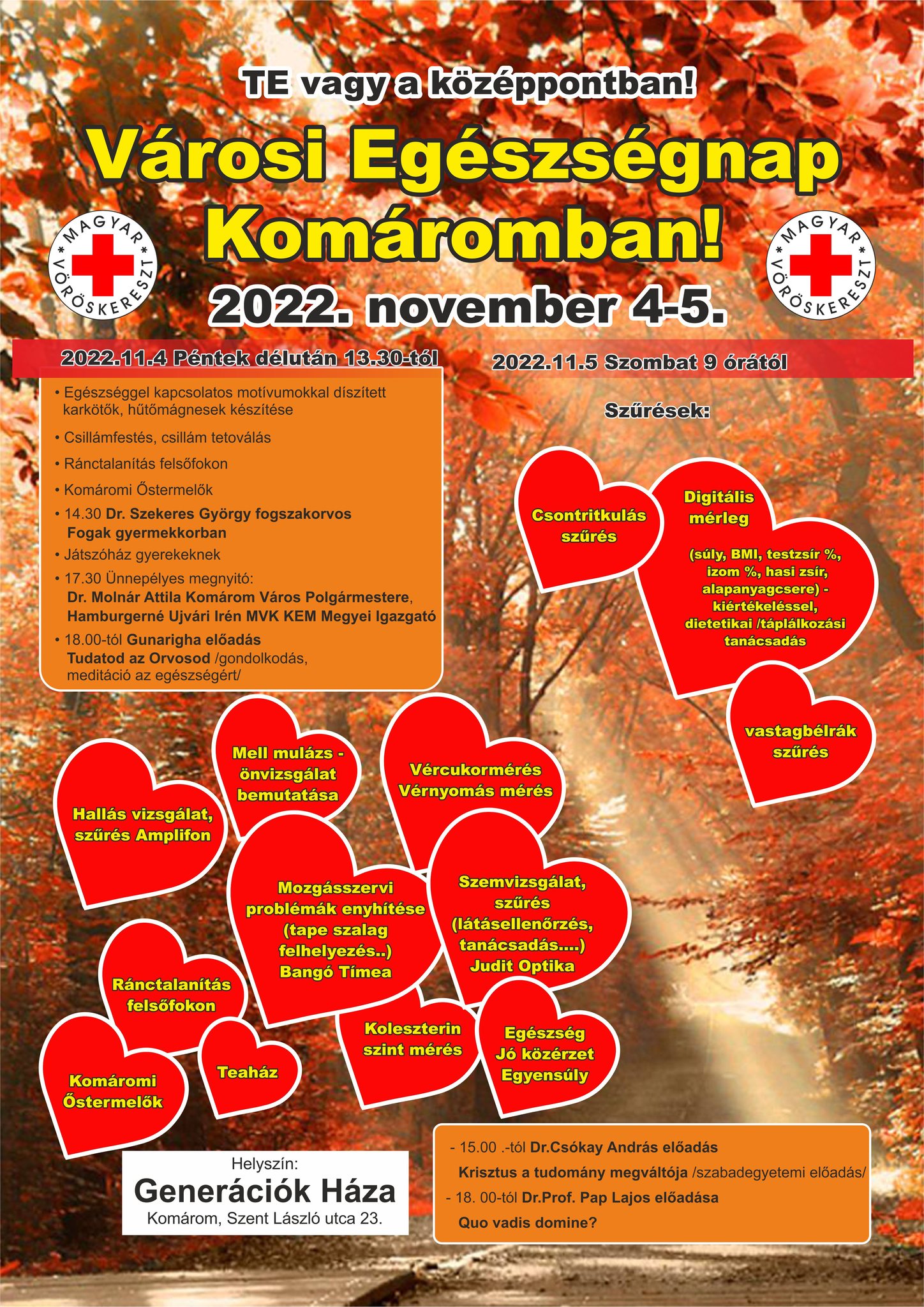 Szombaton ingyenes vizsgálatokkal várják az érdeklődőket, így lesz csontritkulás-szűrés, vastagbélrák-szűrés, digitális mérleg, hallás-vizsgálat, mell mulázs-önvizsgálat, vércukor- és vérnyomás-mérés, koleszterin-mérés, valamint szemvizsgálat. A kiegészítő programok közt teaház, őstermelői termékek várásra várja az érdeklődőket.