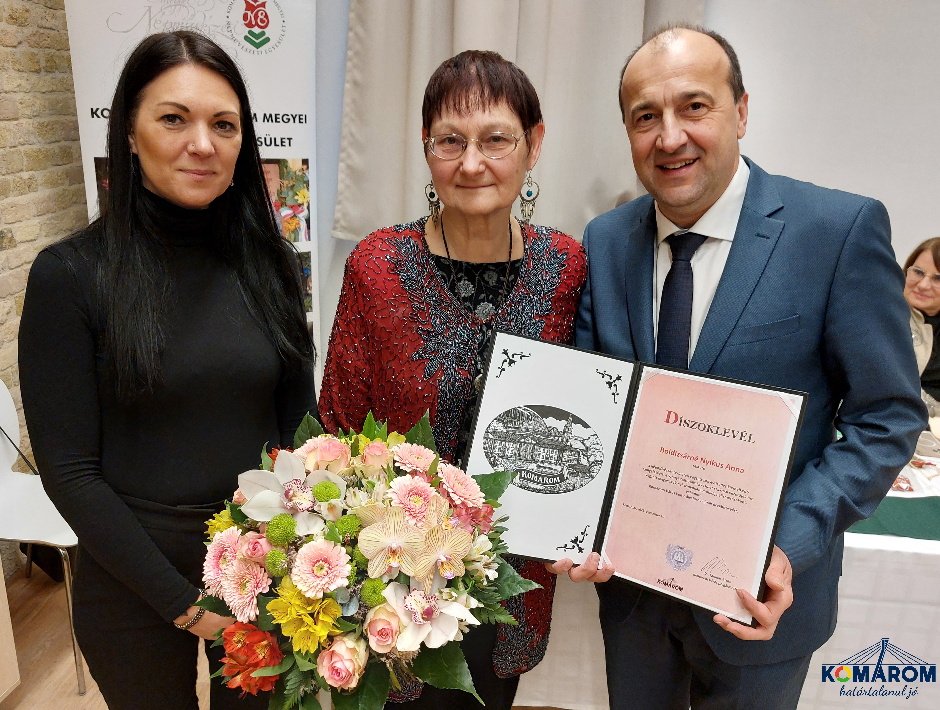Az ünnepi közgyűlésen városunk polgármestere dr. Molnár Attila és Hajnal Dóra, önkormányzati képviselő, a Humán Bizottság elnöke díszoklevelet adott át az egyesület vezetőjének, Nyikus Annának, a népművészet területén végzett sok évtizedes munkájáért és a város kulturális hírnevének öregbítéséért.