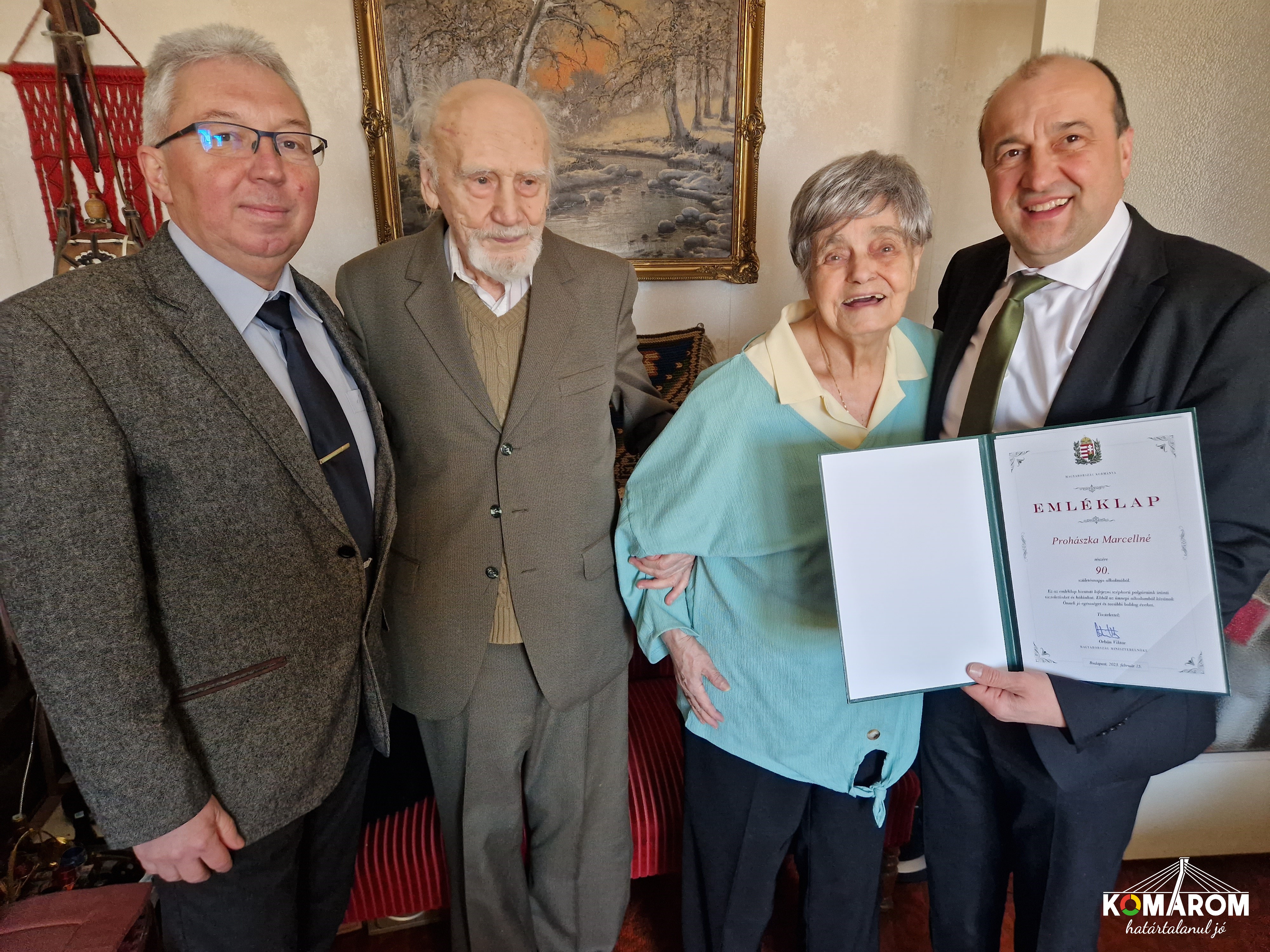 Prohászka Marcell és Éva néni 70. házassági évfordulójukat ünnepelték tavaly. Mint mondják, a házasságban a legfontosabb a szeretet, a türelem, a megértés, az egymásra figyelés és a hit. Két gyermekük született Balázs és Sarolta, hét unokájuk és 12 dédunokájuk van. Éva néni vezető gazdasági ügyintézőként dolgozott kollégiumokban és diákotthonokban. Férje Marci bácsi, 12 évig volt a Széchenyi Közgazdasági Szakközépiskola tanára, majd 22 évig a Gépíró és Gyorsíró Szakiskola igazgatója. Személye megtestesíti a kettészakított város egységét. Munkásságát többek között Kultsár Díjjal és Pro Urbe Komárom díjjal, és díszpolgári kitüntető címmel is elismerték.