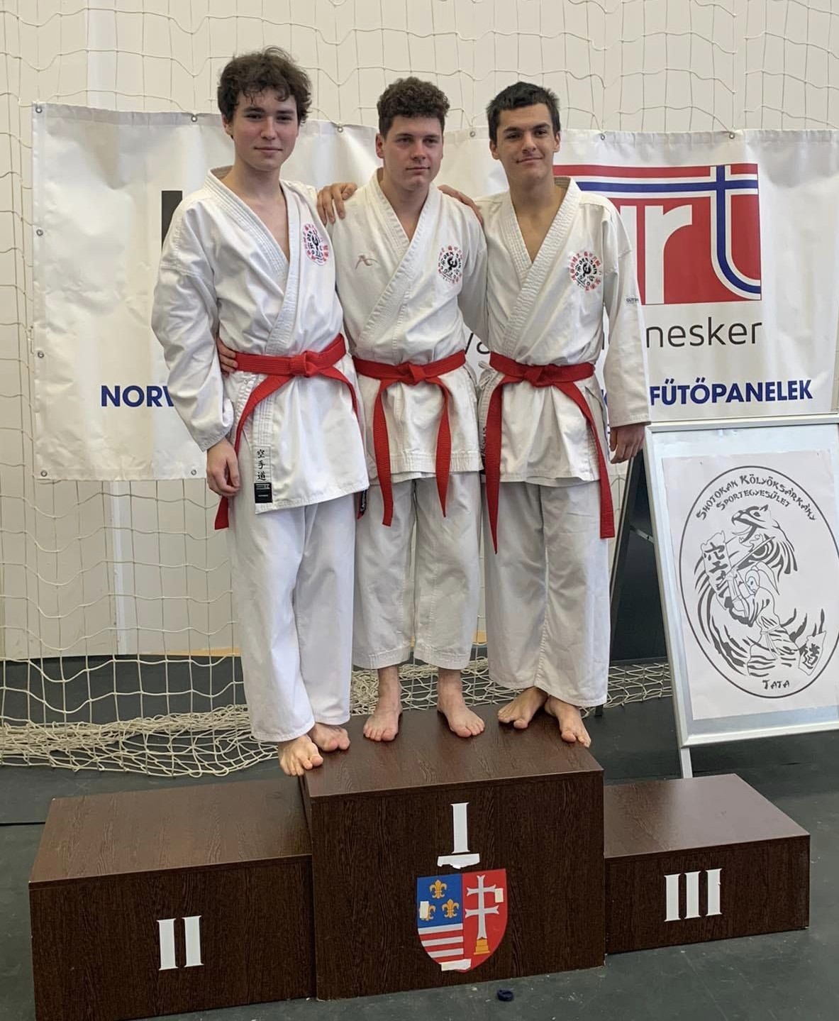 Csajághy Levente, aki a felnőttek között mind katában, mind kumitében nyerni tudott, a férfi kata csapat, valamint