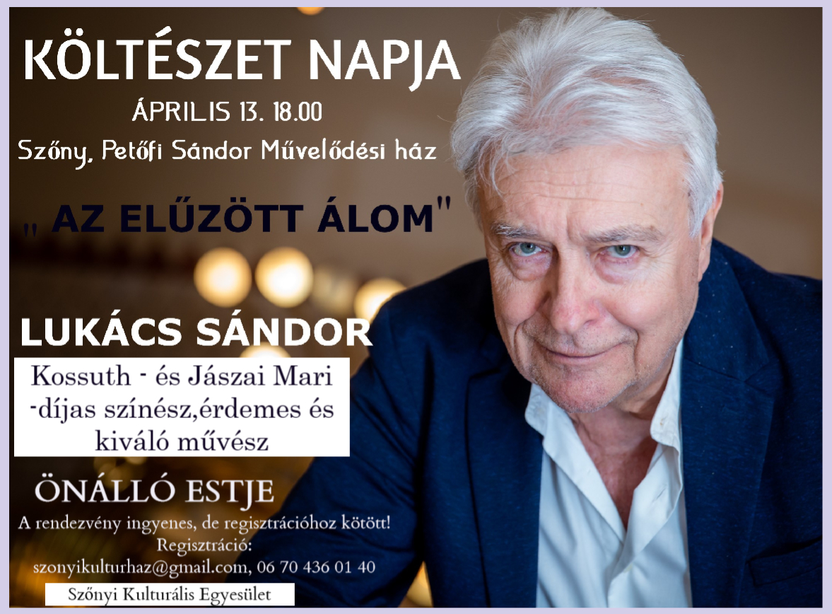 A programsorozat a Szőnyi Kulturális Egyesület szervezésében április 13-án csütörtökön a szőnyi Petőfi Sándor Művelődési Házban folytatódik. 18 órától Lukács Sándor Kossuth - és Jászai Mari - díjas színész, kiváló és érdemes művész "Az elűzött álom" című önálló estjére kerül sor. A rendezvény ingyenes, de regisztrációhoz kötött.