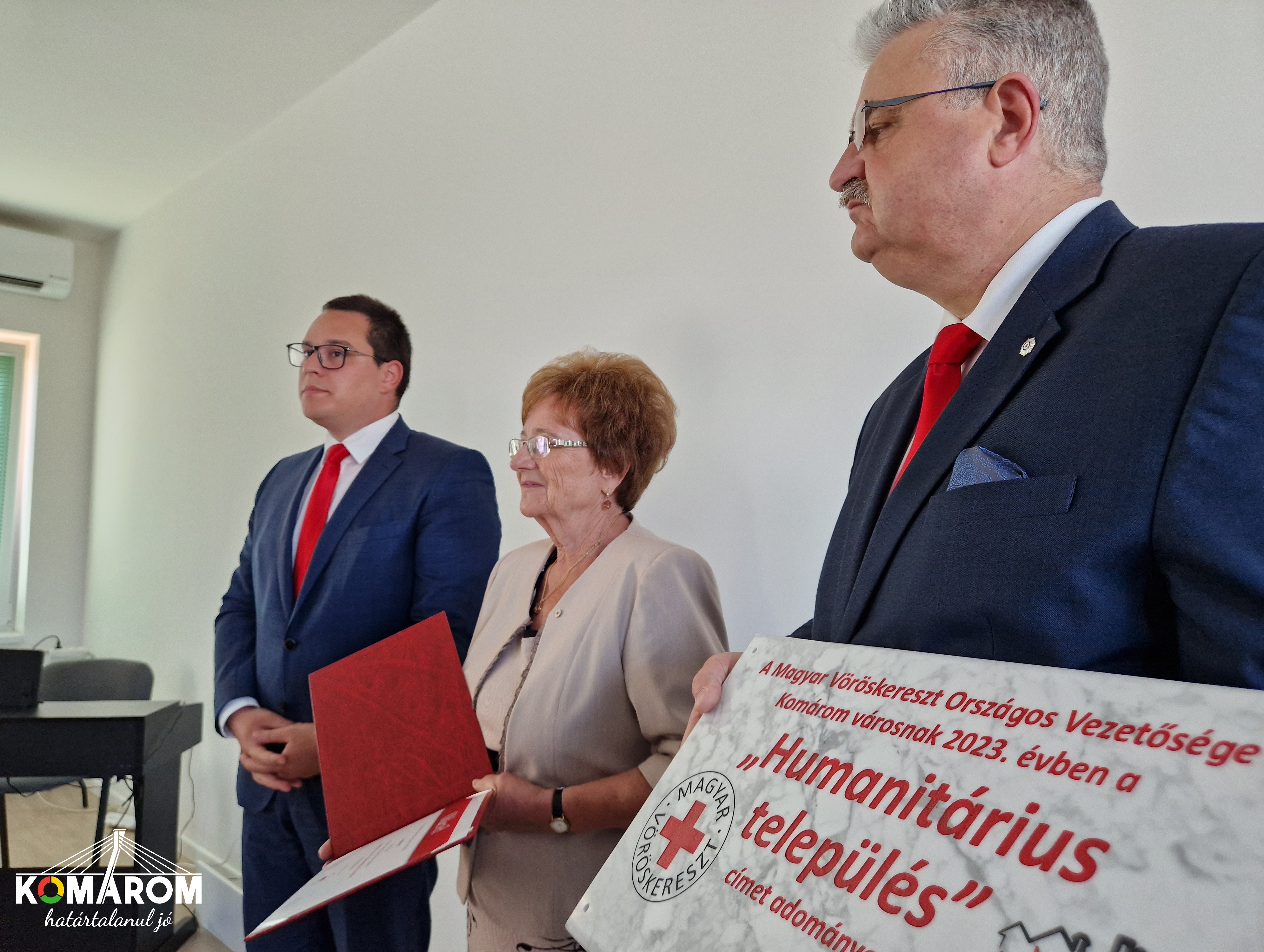 A megtisztelő elismerést városunk nevében Vajda Bence önkormányzati képviselő, a Pénzügyi Bizottság elnöke vette át a Magyar Vöröskereszt elnökétől Fodor Antalné dr.-tól és a megyei igazgatótól dr. Bognár Ferenctől. Vajda Bence a kitüntető cím átadása előtt elmondta, a Vöröskereszt tagjai önzetlenül segítenek, városunkban a szervezet önkéntesei mindenhol ott vannak, legyen szó közösségi rendezvényekről, véradásról, egészségnapról, szolgálatukra mindig számíthatnak a komáromiak. Hangsúlyozta, a város részéről a jövőben is minden segítséget megadnak a komáromi területi szervezetnek.
