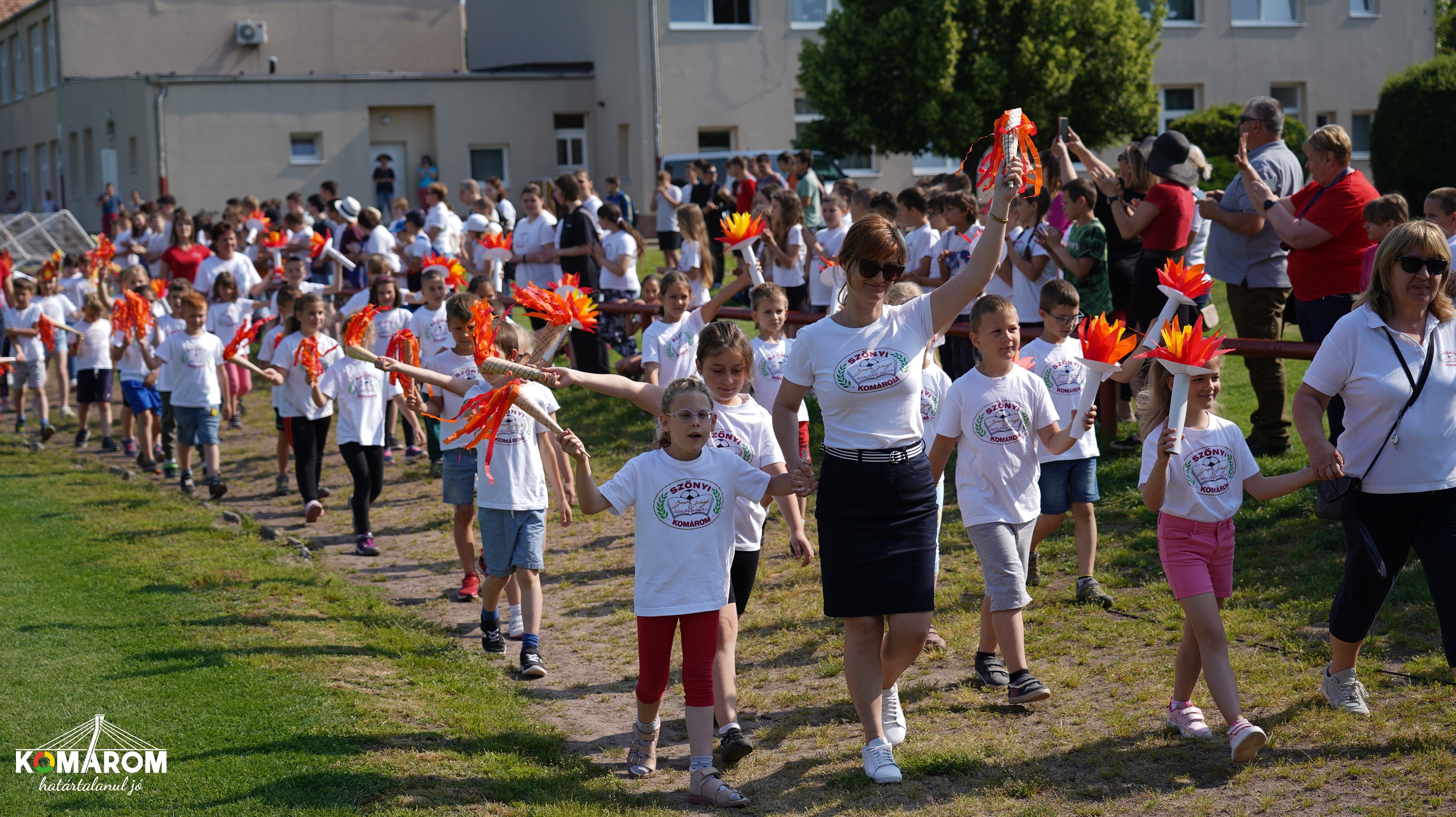 Thoma Ágnes, az iskola igazgatónője beszédében arról is szólt, milyen hagyományokra tekint vissza ez a nap. Akár csak az igazi ötkarikás játékokon, itt is meggyújtották az olimpiai lángot, majd ezt követően megkezdődtek a Bozsik-kupáért zajló fiú labdarúgó, illetve lány kézilabda-mérkőzések. A helyi iskolák csapatai mellett érkeztek fiatalok Bábolnáról és Ácsról is.