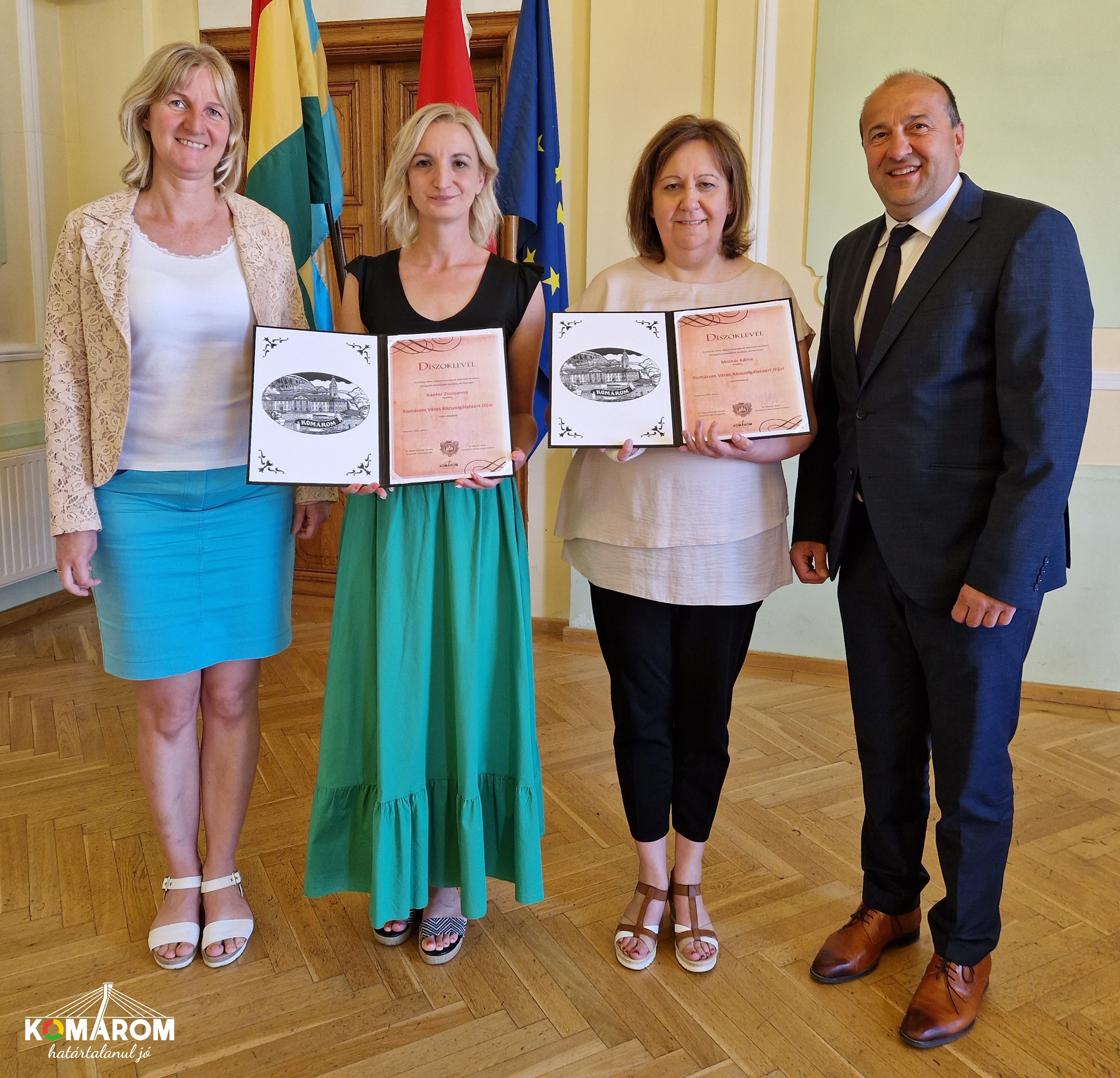 Komárom Város Közszolgálatáért Díjat vett át július 7-én pénteken dr. Molnár Attilától, városunk polgármesterétől és Dr. Baksa-Ströcker Renátától, városunk jegyzőjétől Kántor Zsuzsanna és Molnár Edina, kimagasló közszolgálati munkája elismeréséül.
