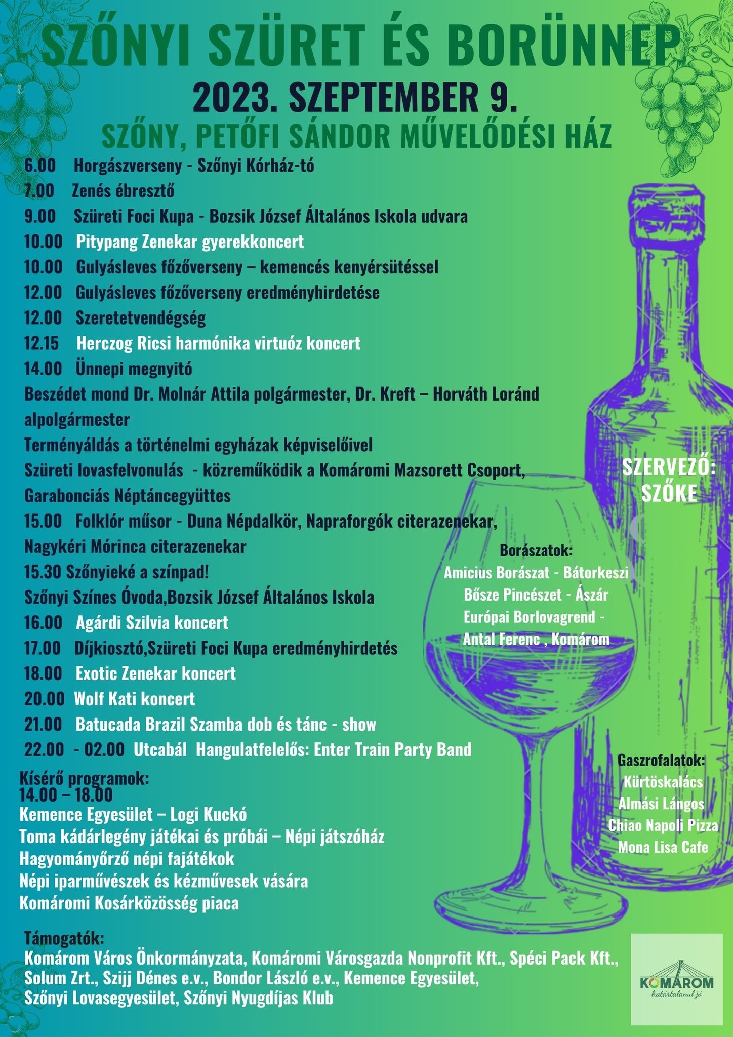 A Szőnyi Kulturális Egyesület szeptember 9-én szombaton rendezi a Szőnyi Szüret és Borünnepet a Petőfi Művelődési Ház udvarán. A programok már reggel hat órakor horgászversennyel indulnak a Szőnyi Kórház-tónál. Hét órakor zenés ébresztővel kedveskednek a szőnyi városrészben élőknek.