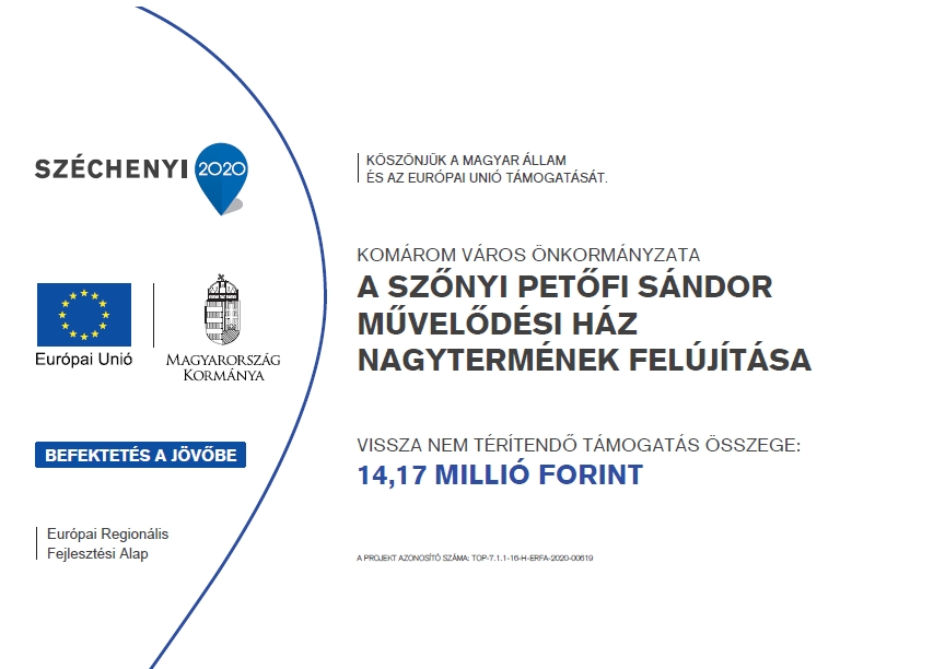 "A szőnyi Petőfi Sándor Művelődési Ház nagytermének felújítása" című, TOP-7.1.1-16-H-ERFA-2020-00619 azonosító számú pályázatára 14,17 millió Ft vissza nem térítendő európai uniós támogatást nyert Komárom városa. A pályázat fő célja a művelődési ház, mint közösségi tér épületének bővítése.